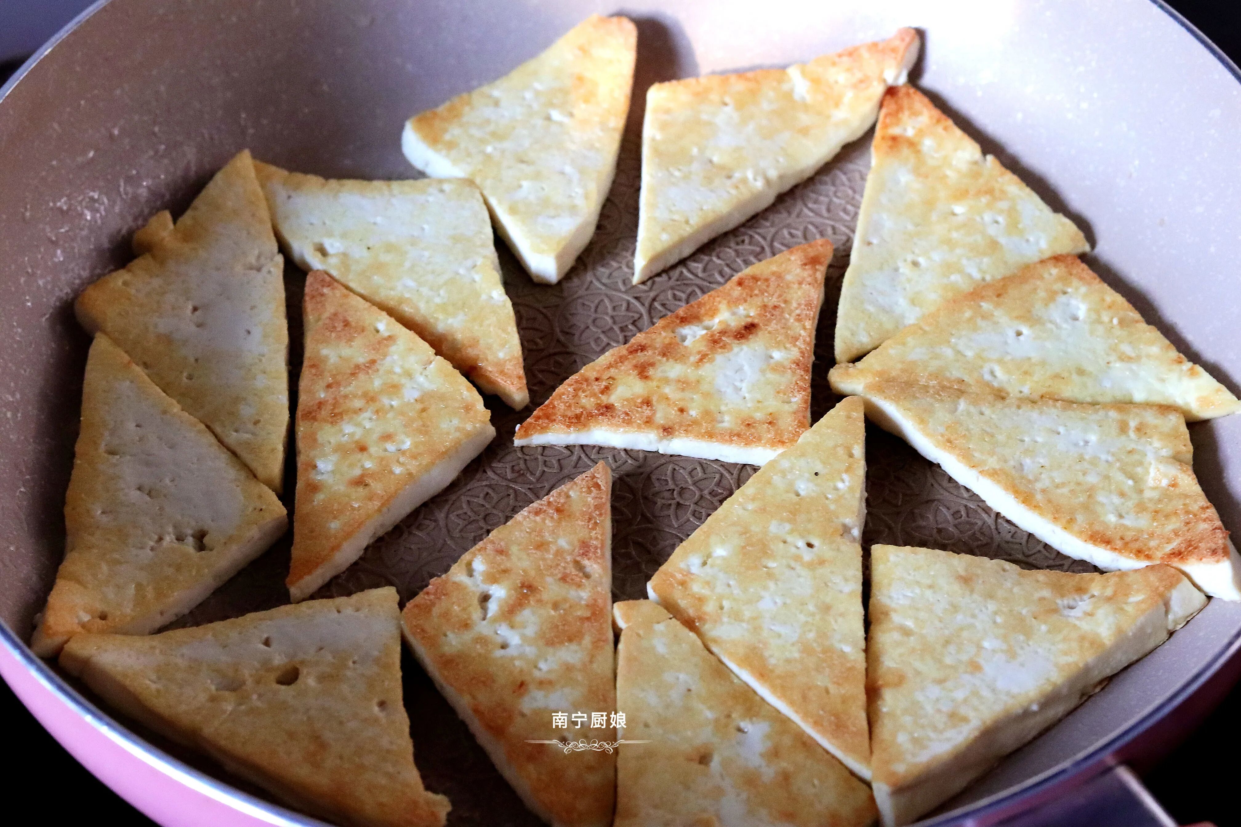 1、使用平底锅,锅热放入适量食用油,油热将切好的三角形状豆腐迅速放进锅中,一片一片有序的排列开,这样更容易每个都煎表面微微焦黄。等待豆腐煎熟之后,装盘待用。