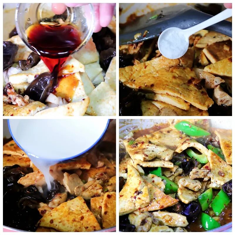 5、最后进行调味,放进去水、盐、鸡精、糖、蚝油。使用锅盖盖住,焖上大概三分钟就可以。最后将切好的青椒放进去,把之前准备的水淀粉勾芡翻炒,香油也淋上一点之后就装盘。