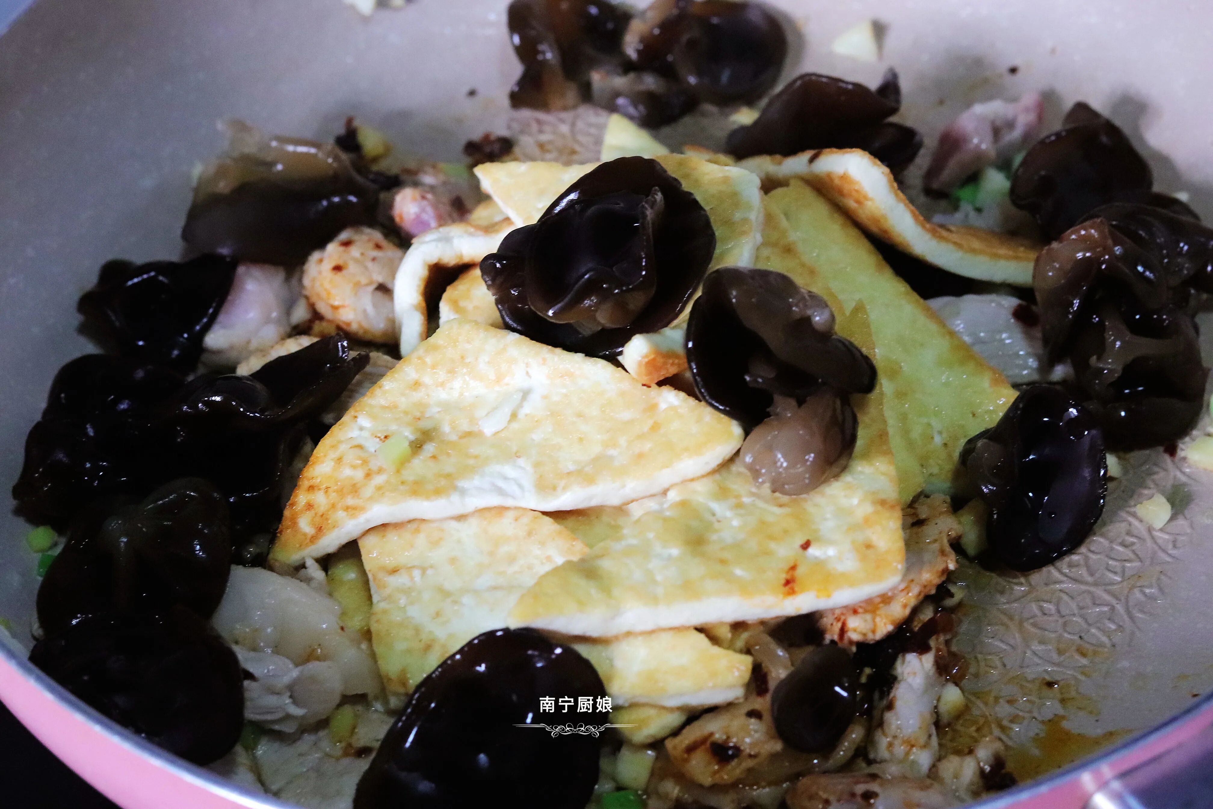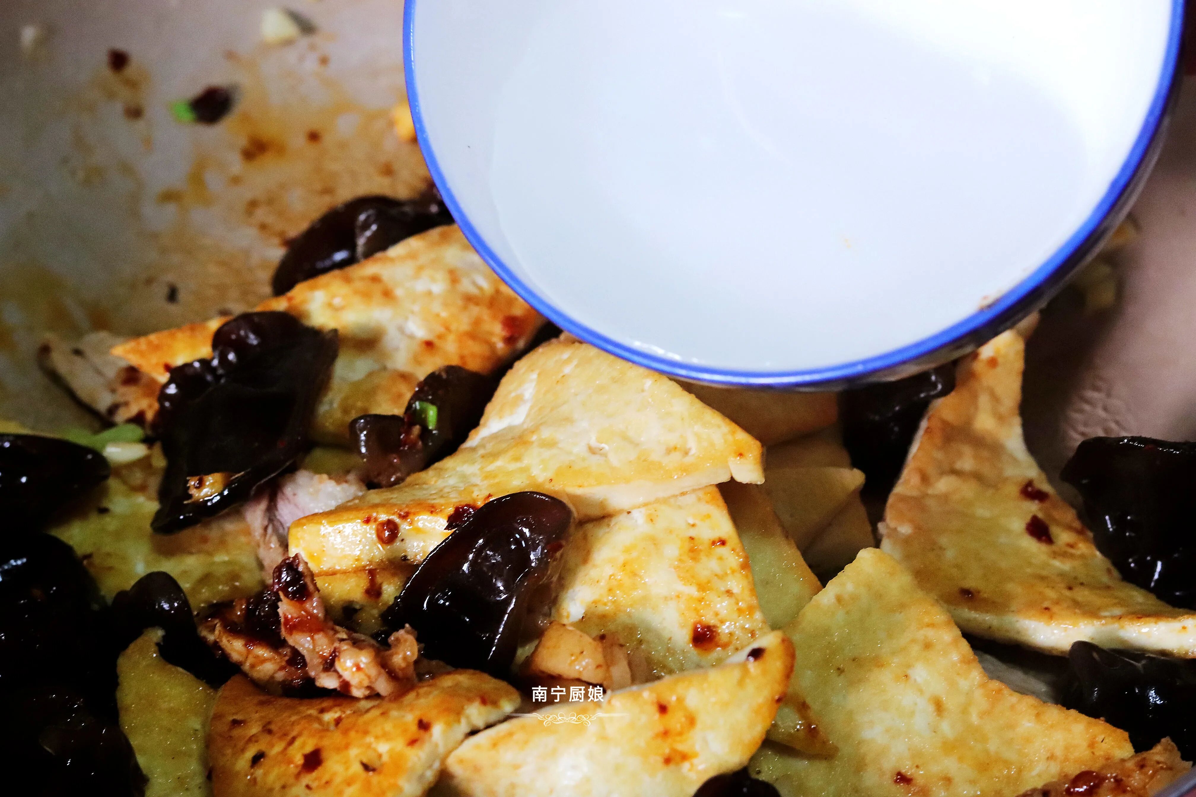 4、泡发的木耳控水之后放入锅中翻炒,放入一点清水进去。