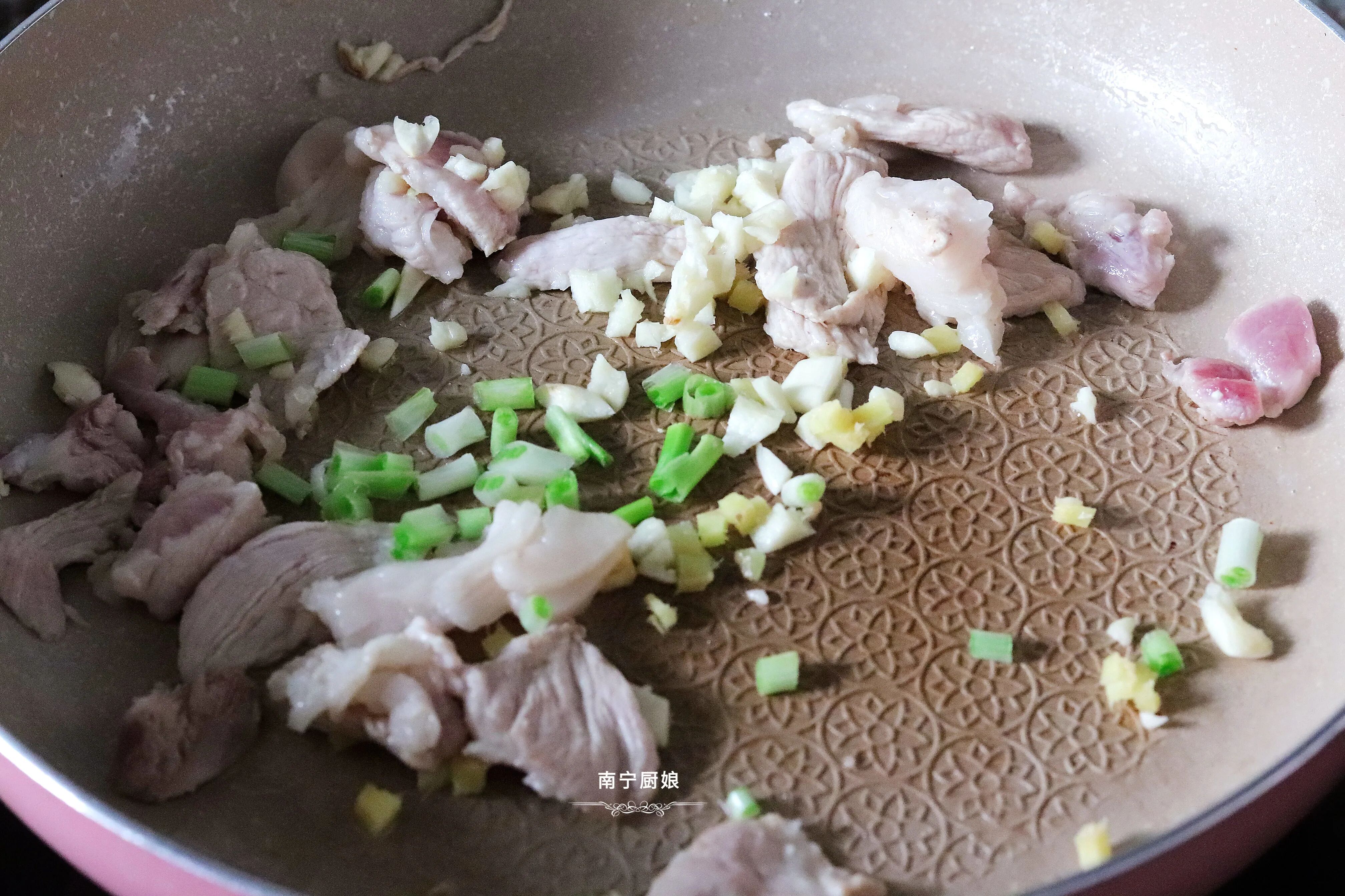 3、放一勺辣酱充分炒香后,将切好的葱姜末放进去炒香,撒上适量料酒和酱油。