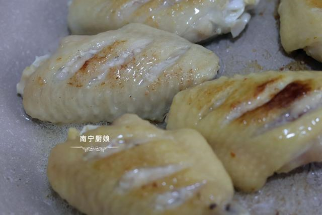 3、煎鸡翅:在平底锅上放入少量的油,油锅热把鸡翅放在不粘锅上煎,两面金黄的程度就可以完成。