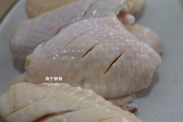 2、清洗干净后的鸡中翅需要在表面划上几道口子,这样酱汁能更好地融入进去,一定程度上鸡翅非常容易熟。