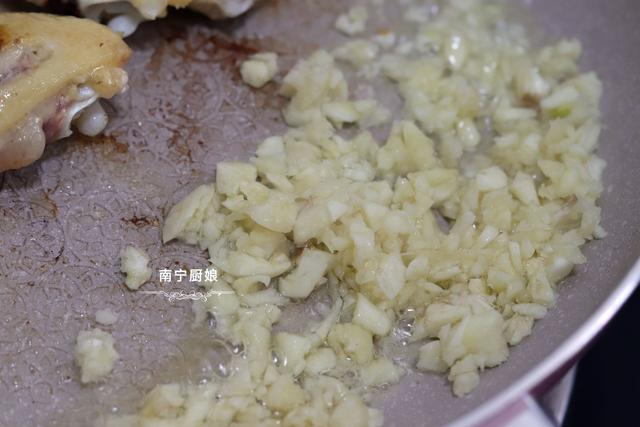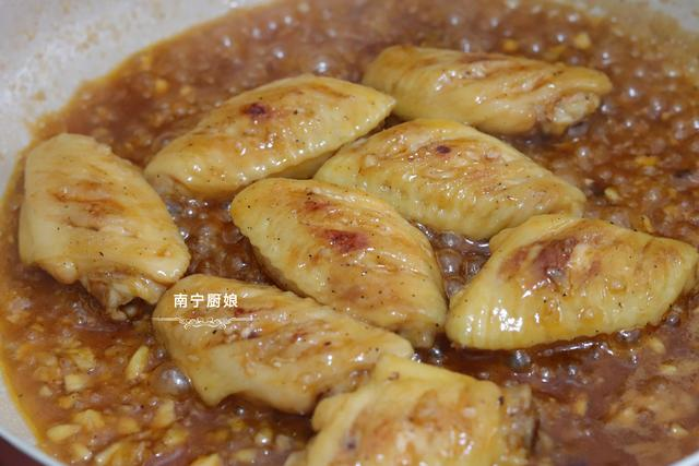 4、把蒜在锅中炒香,鸡翅也一并翻炒几下,使蒜的香味能够融入进去。然后把酱汁倒进锅中,开火盖锅盖燜煮十分钟的程度就可以。这时候锅中的汤汁也会变得黏稠,鸡翅的程度也比较好,入味而又鲜嫩。