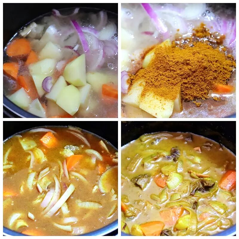 5、开盖,放入洋葱丝、胡萝卜块、土豆块、咖喱粉,搅拌均匀,继续选用煮饭模式来加热个20分钟左右即可出锅。