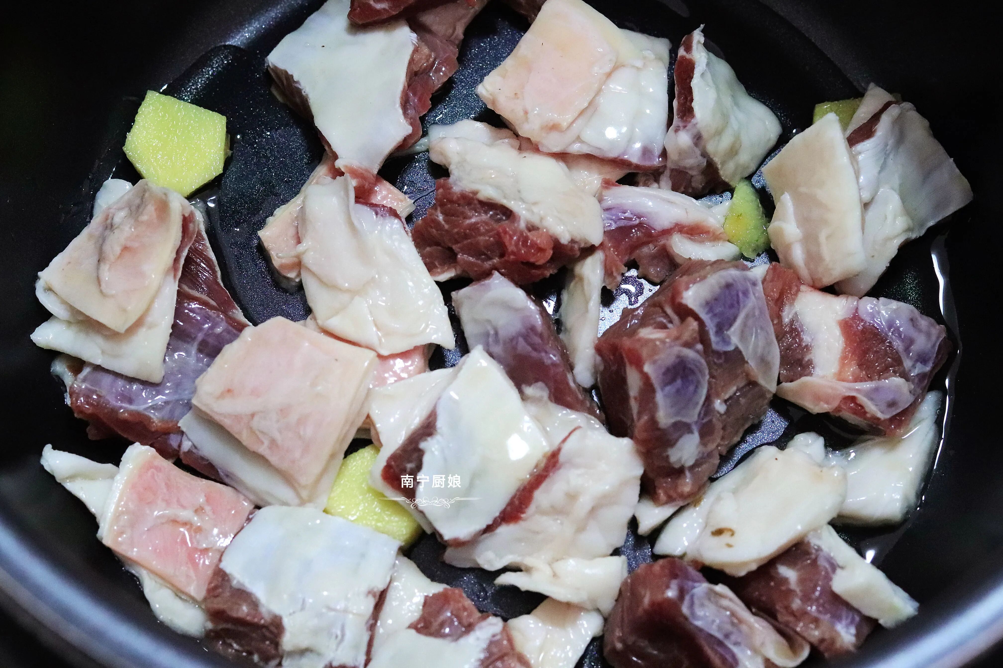 1、如果牛腩大家怕腥味重,可以提前焯水一次,这样不仅能去除膻味,还能节省后续的烹调时间。当然,如果你怕麻烦,其实和我一样,第一次用电饭锅放入生姜把牛腩加热压一下,也能起到去腥的作用。