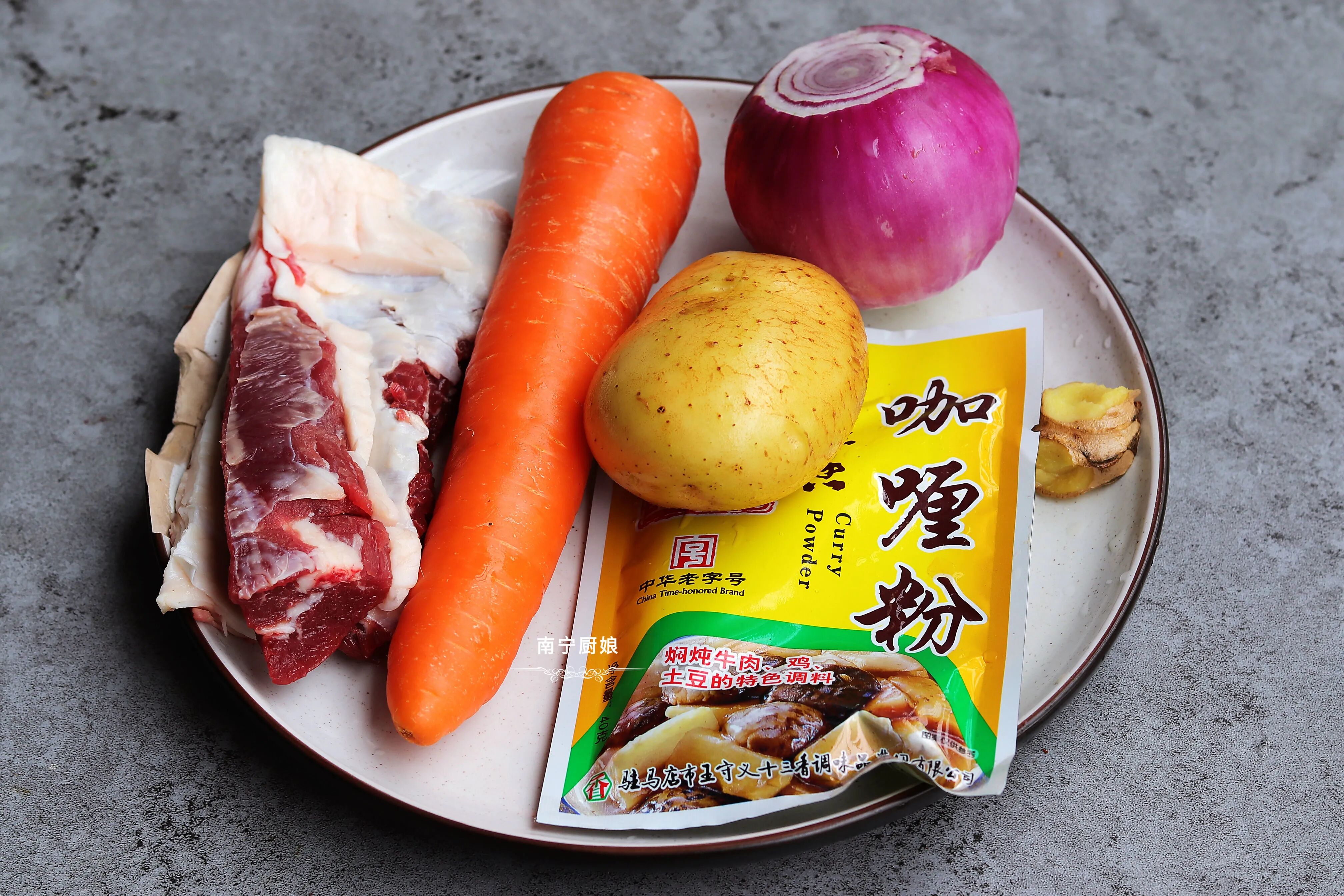 首先准备食材:牛腩350克、土豆1个、一包咖喱粉(最好使用咖喱块)、胡萝卜1根、洋葱1小个、食用油10克、 生姜1小块。