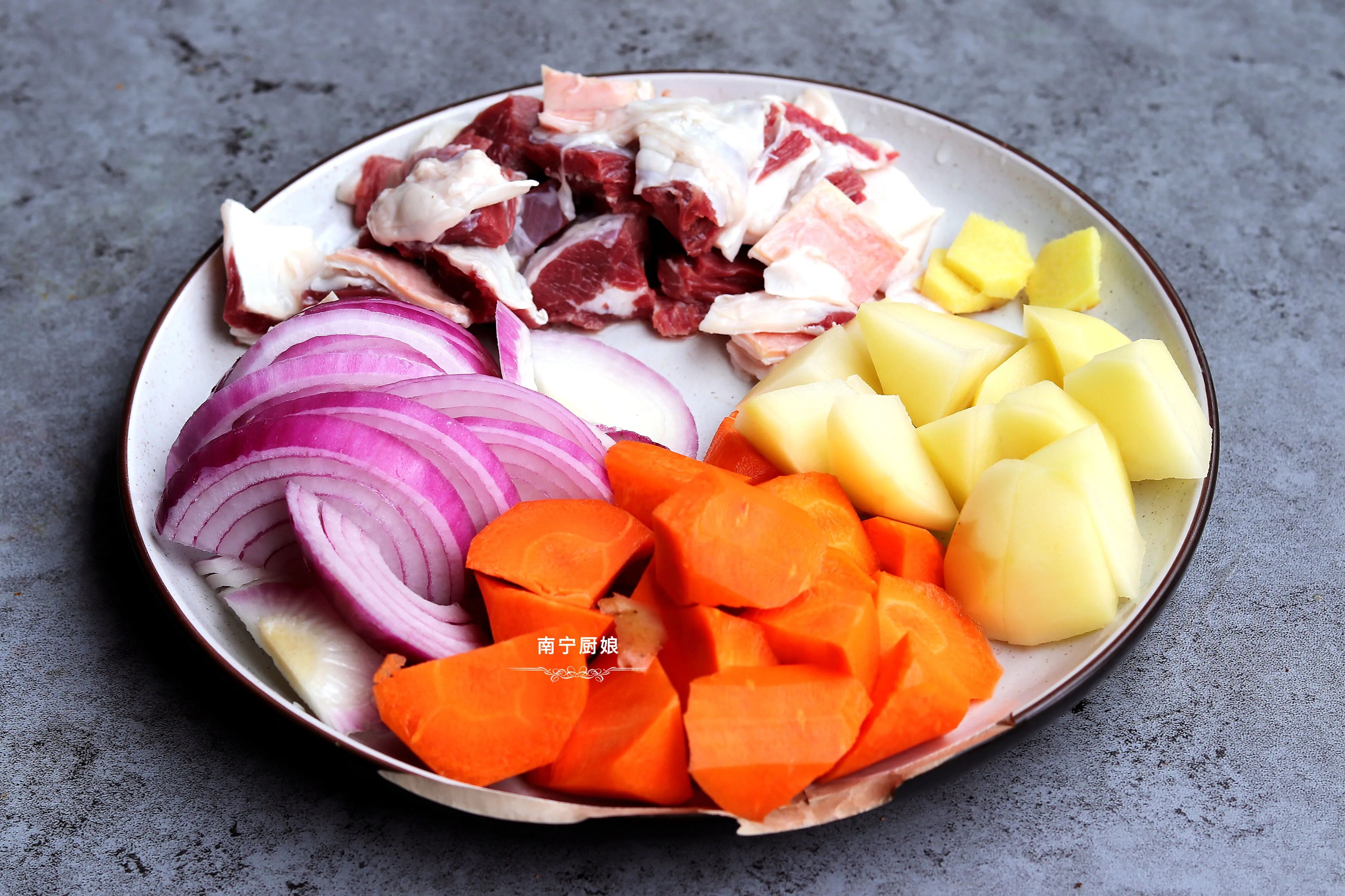 1、把胡萝卜洗净去皮后切块,洋葱切条首先,牛腩洗净后切成块,土豆去皮后切成块,生姜去皮切成小块装盘待用。
