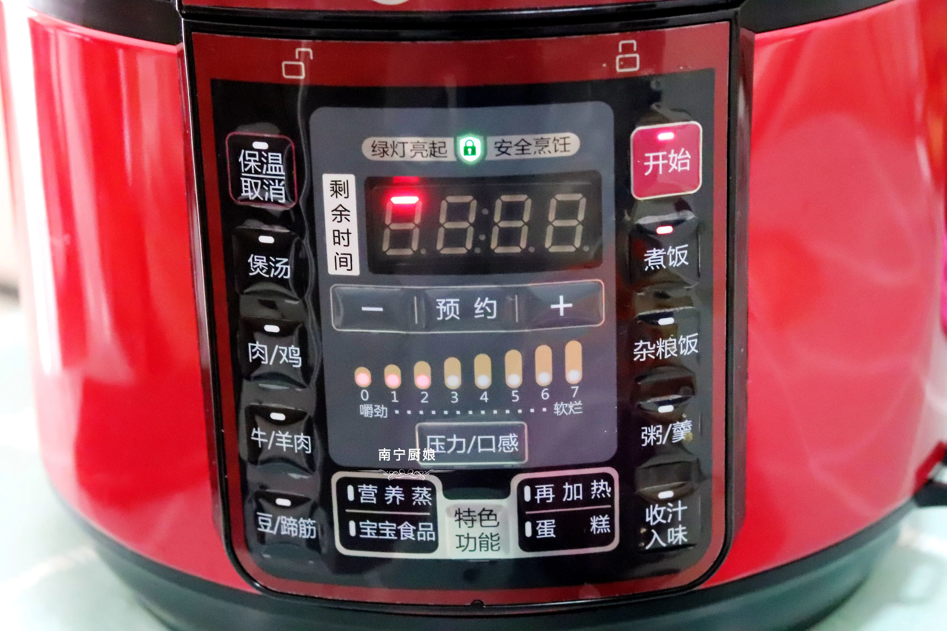 3、盖上电饭锅,选择“煮饭”按键,加热个10分钟,打开锅盖,翻动一下牛腩,如果有生成血沫,可以用厨房纸给吸走。