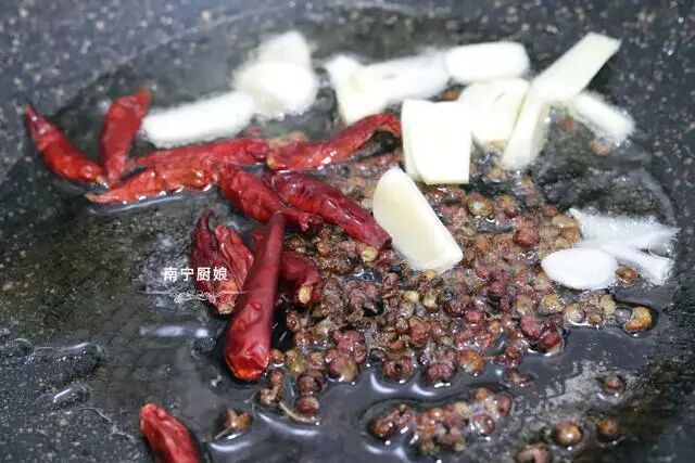 6、 干辣椒,蒜片在油锅中爆香后,趁着油温热直接浇在鱼片上,这时候鱼肉的香味就会出来。