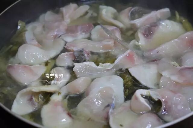 4、之后把酸菜放进去翻炒,等待酸菜的香味出来后直接加入开水,水要没过酸菜,开大火把汤煮开。把鱼骨先放在锅中,当鱼汤发白的时候就可以将鱼片小心地铺在锅中,因为鱼片比较嫩薄,所以一定要快速放入,慢的话鱼片就会被煮老。