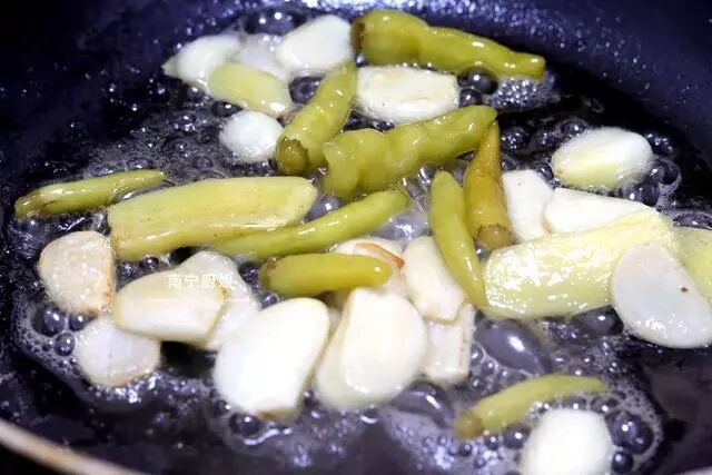 3、锅中放油,油热后先把姜蒜和酸辣椒放入锅中,用小火慢慢爆香。