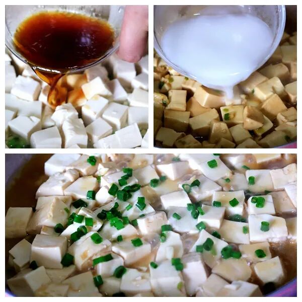 5、把之前调制好的汁料倒进锅中,将其煮开。时间到了之后,将调和好的水淀粉淋在豆腐上,开大火烧至汤汁浓稠,在上面撒上一层葱花即可出锅。