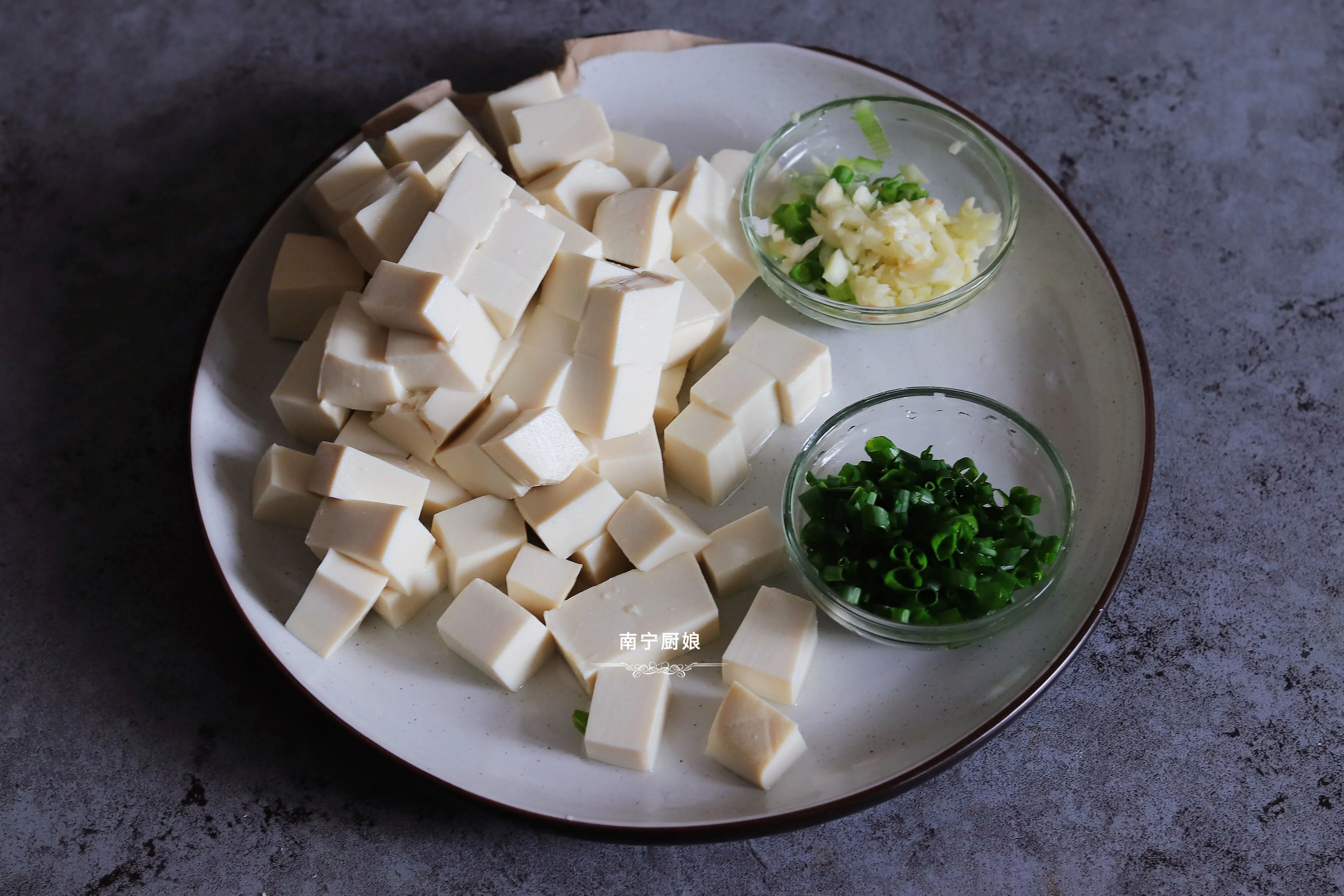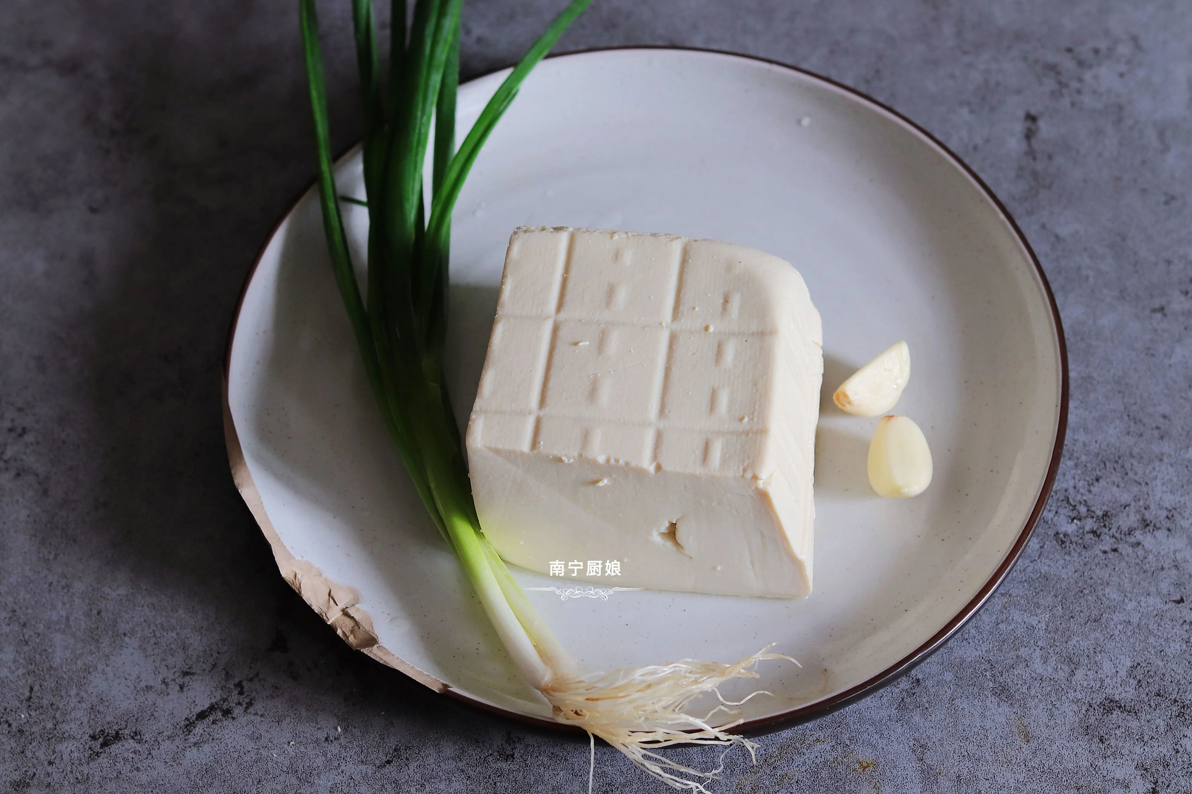 1、买来的整块豆腐在水龙头下冲洗一下,因为豆腐上可能会有一些比较黏的东西,为了口感好,也为了吃得更卫生。冲一下之后用刀切成小方块,规则的小正方体就可以。小葱剥去皮后,掐掉葱叶部分中不可食用的部分,洗干净切成小葱花。大蒜剥皮,用刀切碎,更方便的方法可以直接用大蒜带皮给刀拍碎,皮就能够轻松的去除掉,要使用那种平面的切菜刀,不需要太用力就可以拍碎。