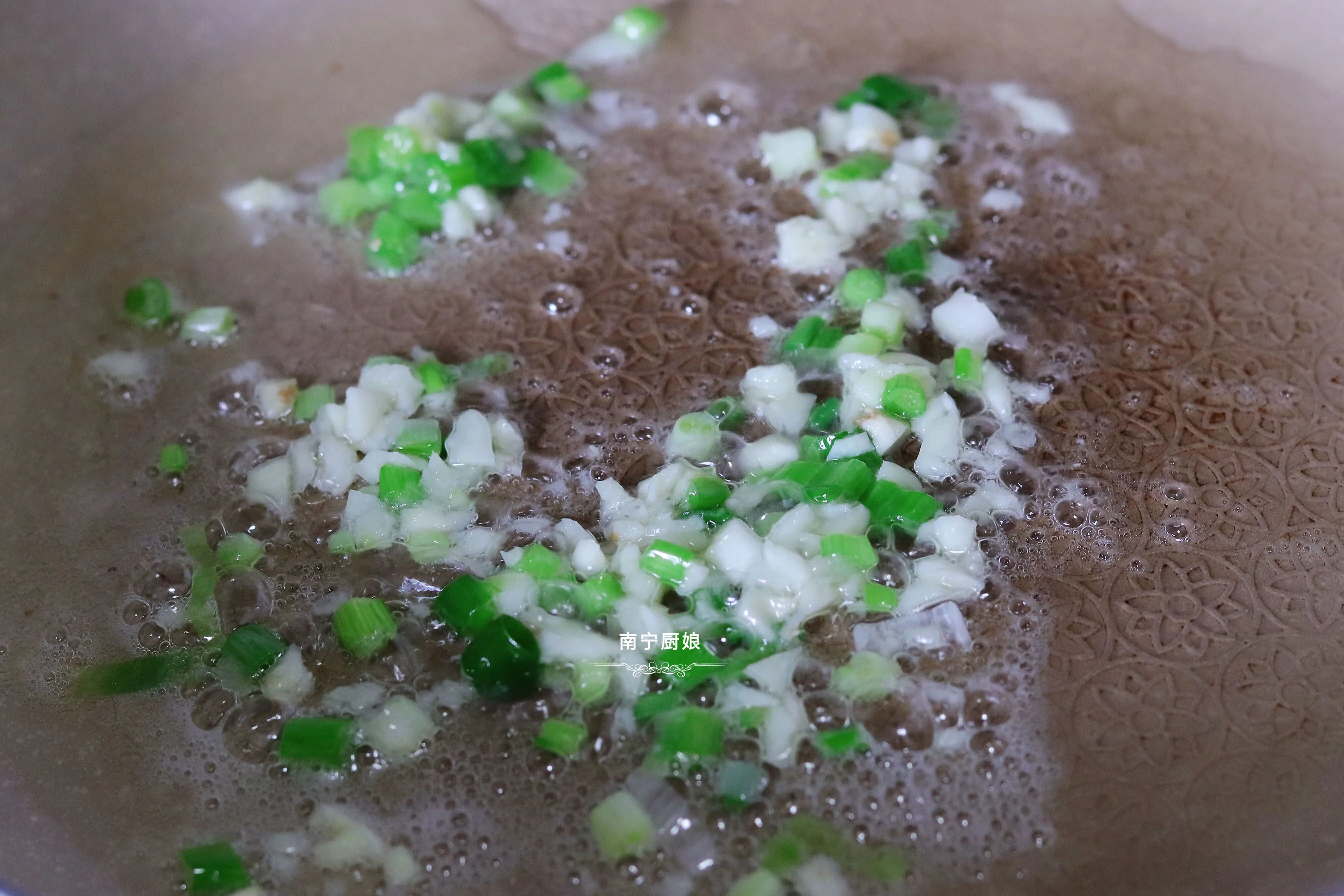 3、锅中放油,首先把蒜末和葱白放在热油当中爆香,把蒜香和葱香的味道逼出来。
