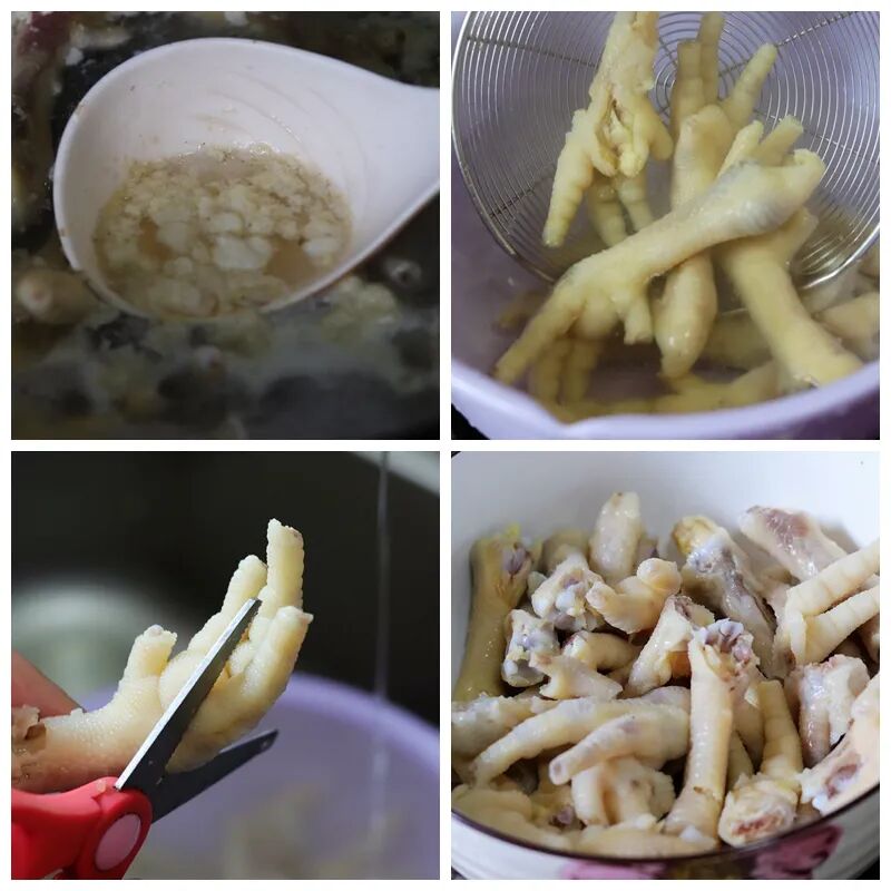 1、鸡爪的部位是比较脏的,用剪刀剪掉,然后清洗干净。使用开水煮熟,煮的时候锅中要放上一些姜片,倒入一些料酒。这2样能够去除鸡爪中的腥味。