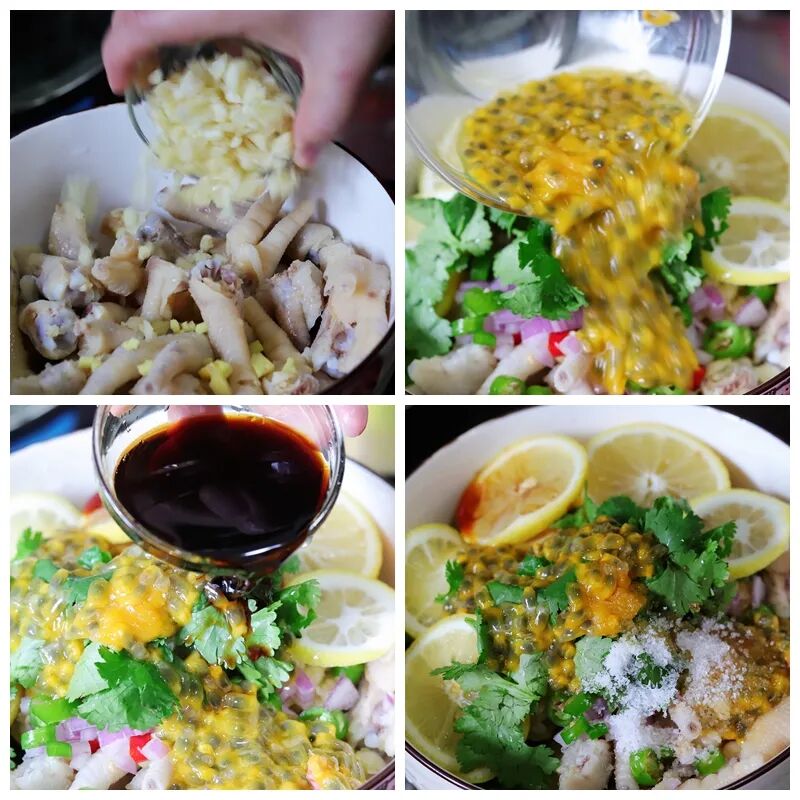 3、泡过冷水之后把鸡爪捞出放在盆中,在盆中放入半颗切片的柠檬,大蒜可以弄成蒜泥放进去,把 百 香 果 也 放 进 去 ,小米辣和线椒切碎或切断放进去都可以,放姜片和生抽,盐和糖,最后弄上香菜,搅拌之后腌制一段时间。放入冰箱中冷藏,口感更好,一定要记得加上保鲜膜。