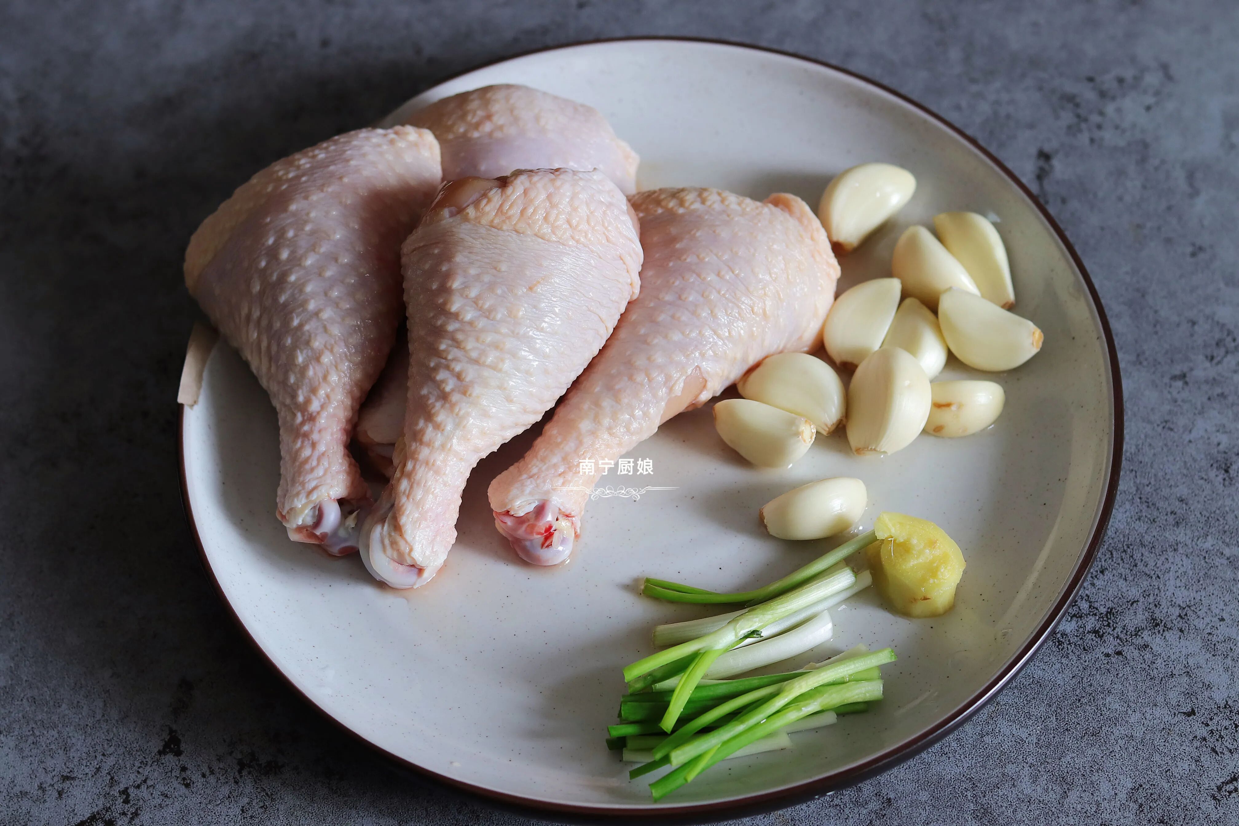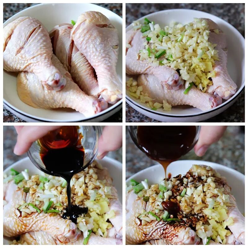 1、大蒜用刀拍扁去皮后切碎,生姜切碎,葱段拿一小部分切碎,在鸡腿上面用刀划上几个口子,鸡腿放大碗中,把葱姜蒜碎倒入鸡腿中,放入一勺生抽,老抽半勺,耗油1勺。家里有保鲜袋的朋友,可以把鸡腿和配料搅拌均匀后,倒入保鲜袋中密封起来,冷藏半个小时以上。