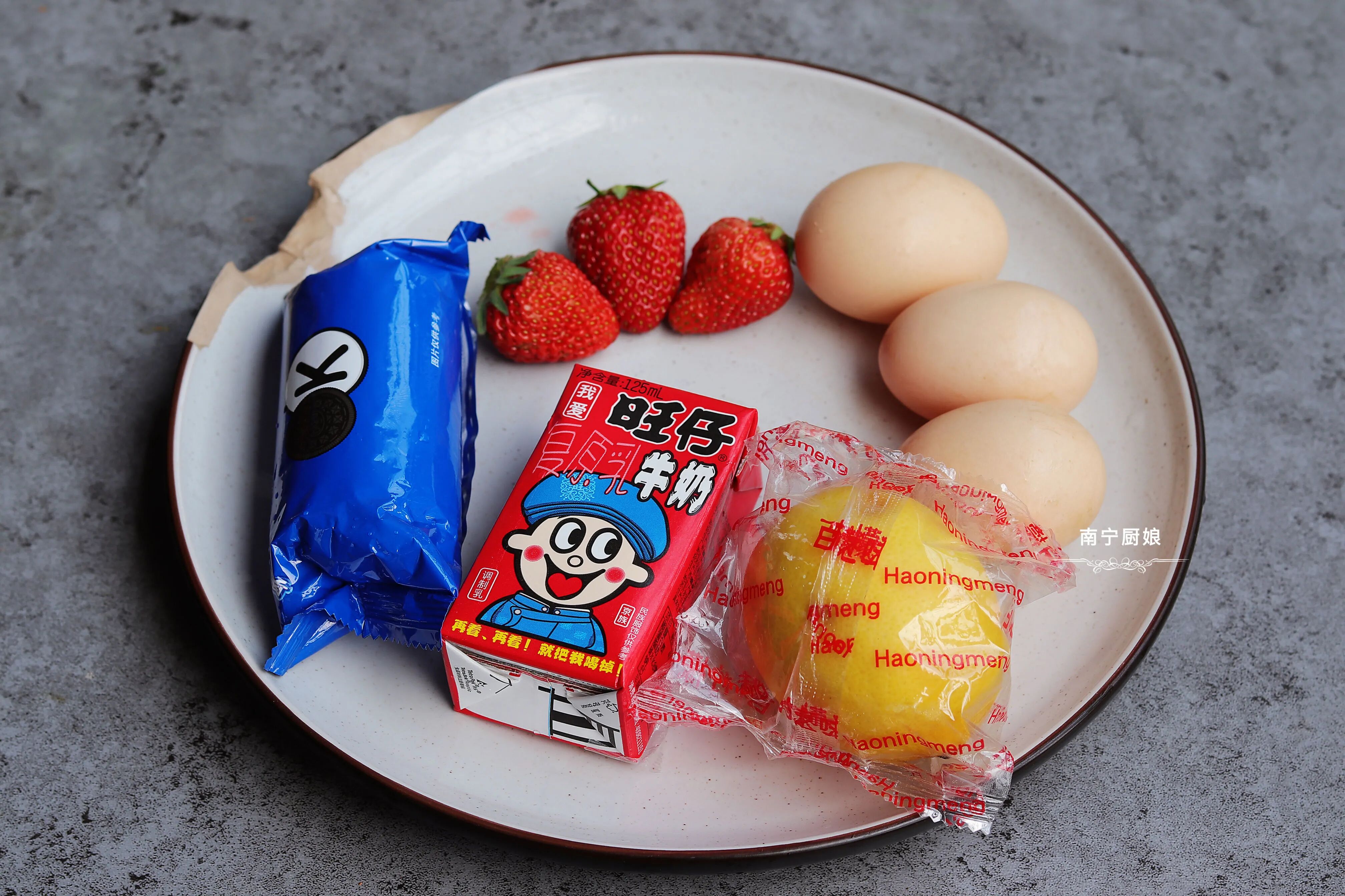 准备好食材:旺仔牛奶1瓶、柠檬1个、鸡蛋3颗、草莓3颗、奥利奥饼干4块。