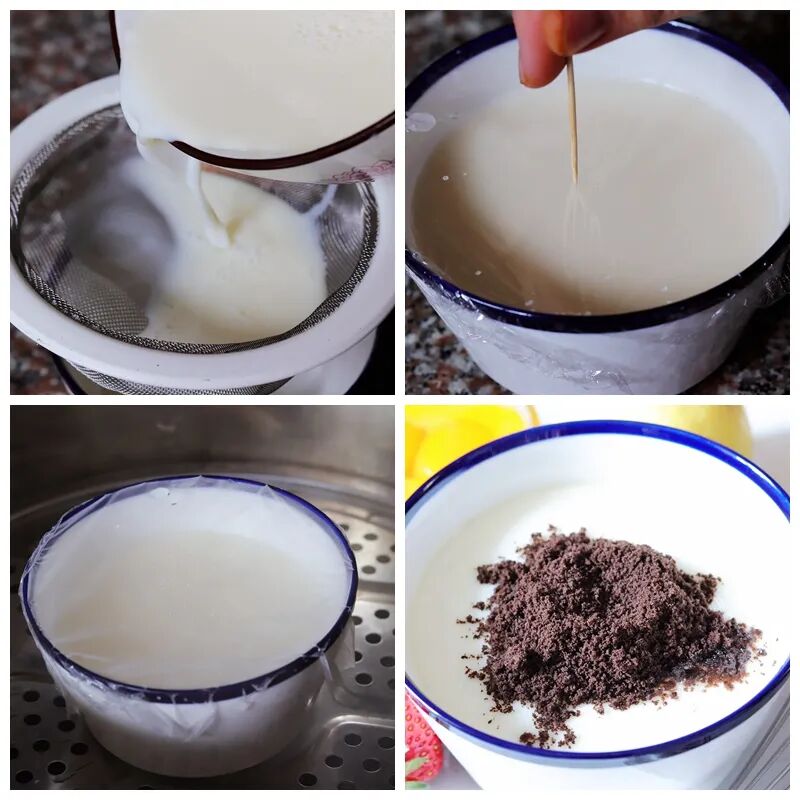2、为了让口感更细滑,所以我们过筛一次,去掉浮沫。盖上耐高温保鲜膜,用牙签在保鲜膜上扎上几个小孔。在蒸锅中烧开水后,把装有双皮奶液的碗放入蒸锅中,调中火蒸15分钟,关火焖5分钟,取出待凉,不急着吃的话,建议先冷藏半小时后再取出食用口感更佳。冷藏拿出冰箱后,把奥利奥饼干取黑色部分放入保鲜膜中,用擀面杖碾压成细粉状,撒在双皮奶上。