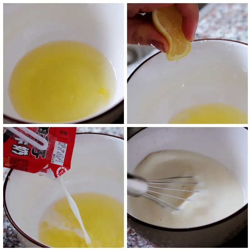 1、把三个鸡蛋分离出蛋清、蛋黄,我们使用的是蛋清部分备用。在蛋清中挤入柠檬汁,再倒入旺仔牛奶,用打蛋器充分的打散。