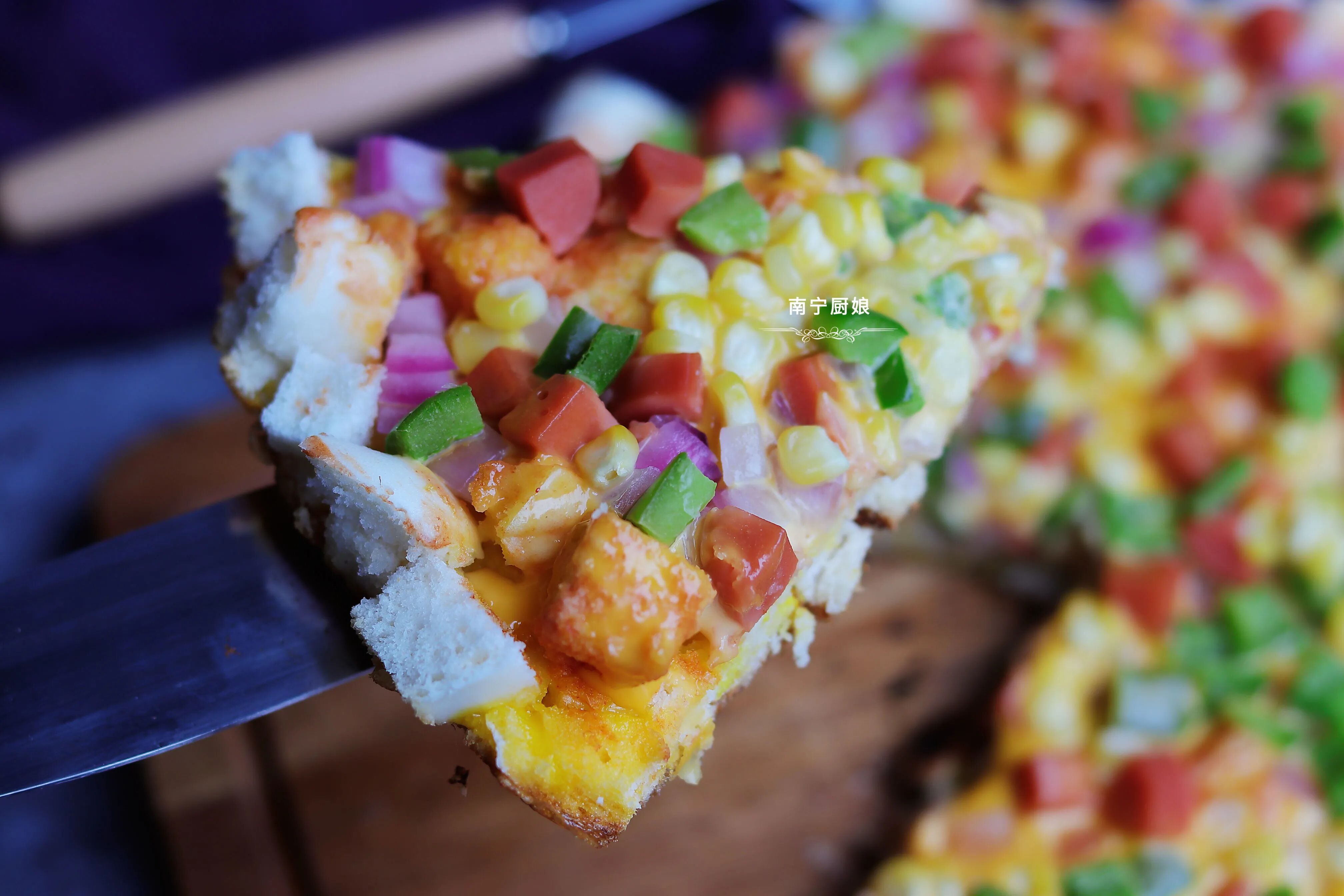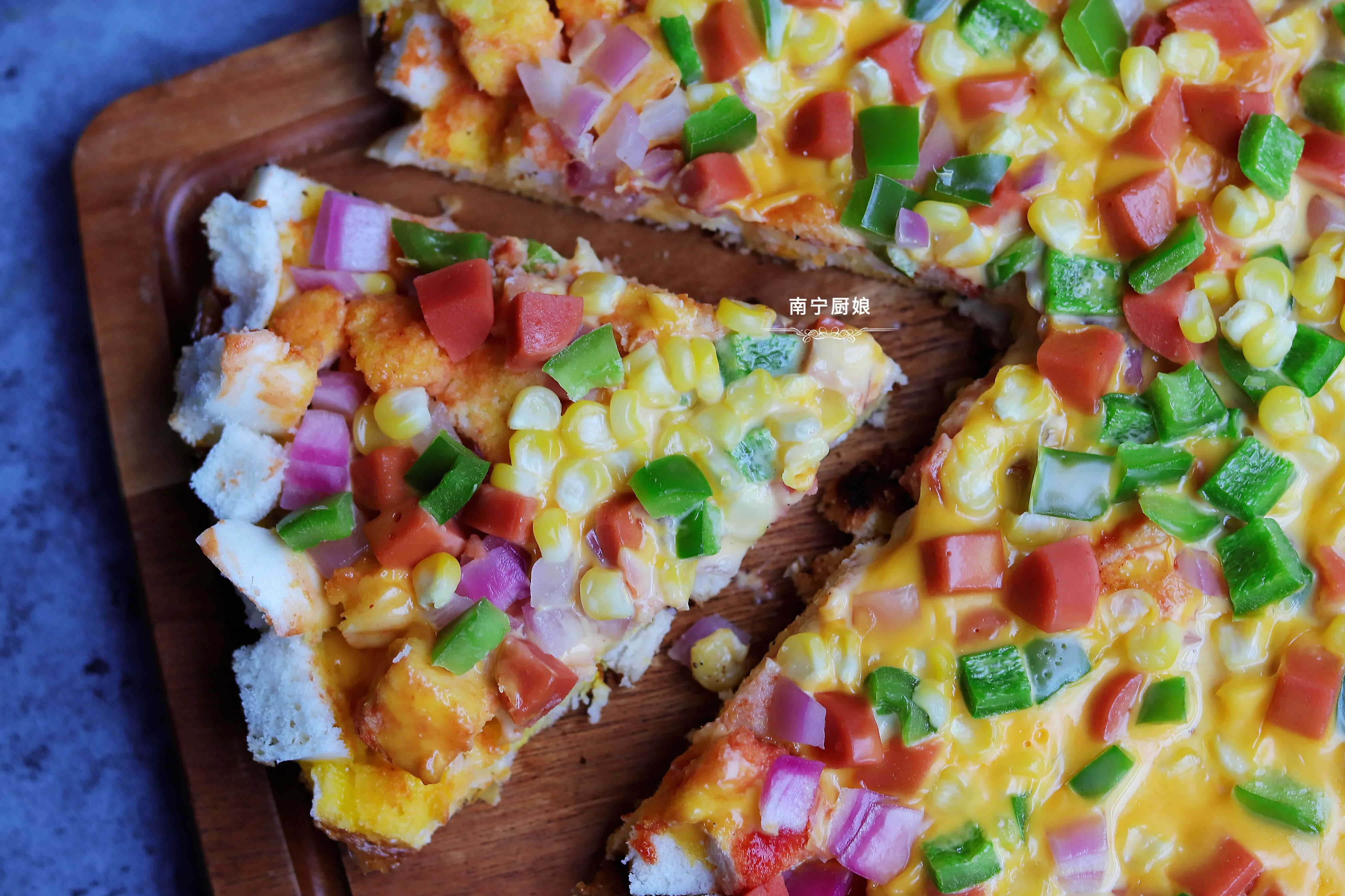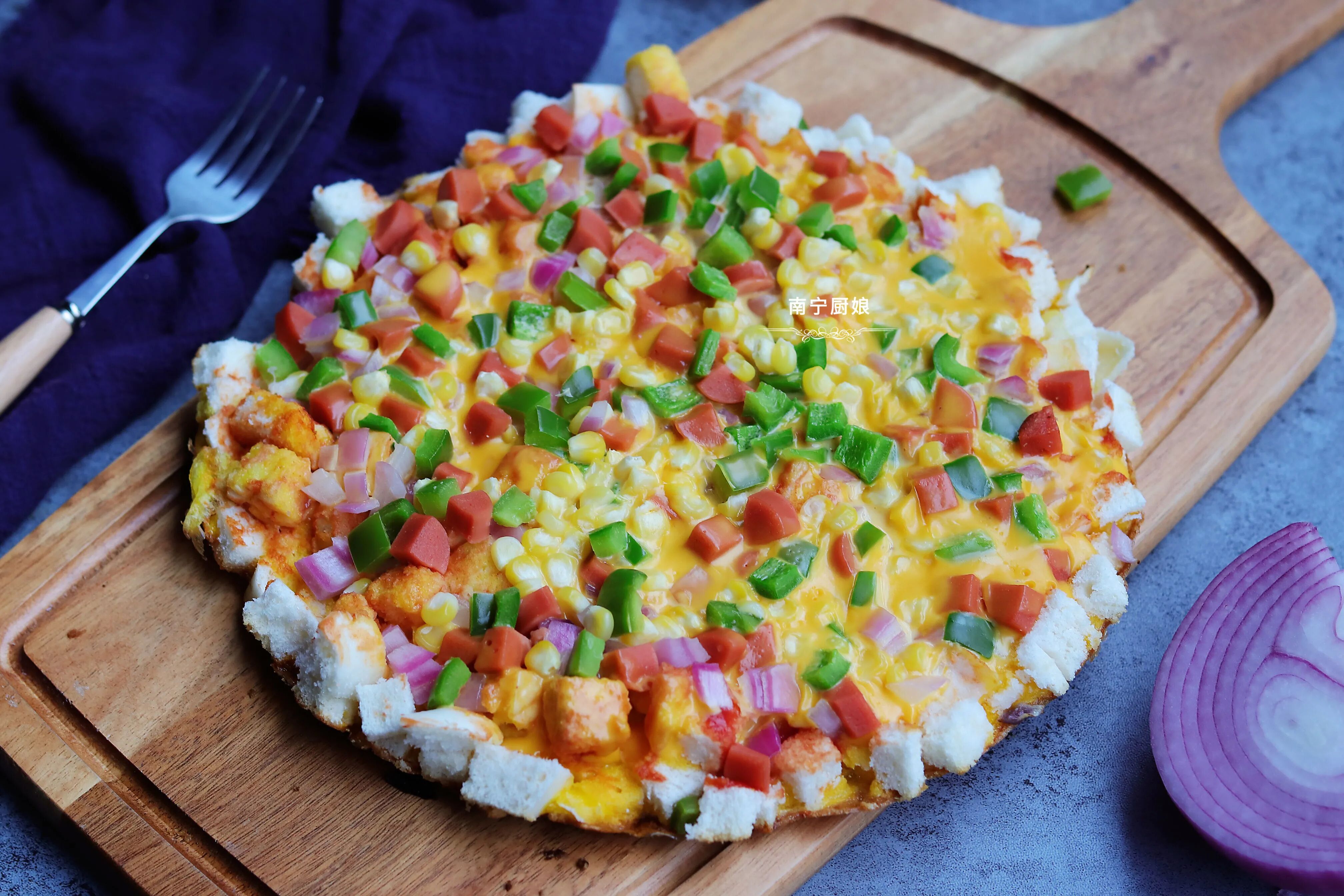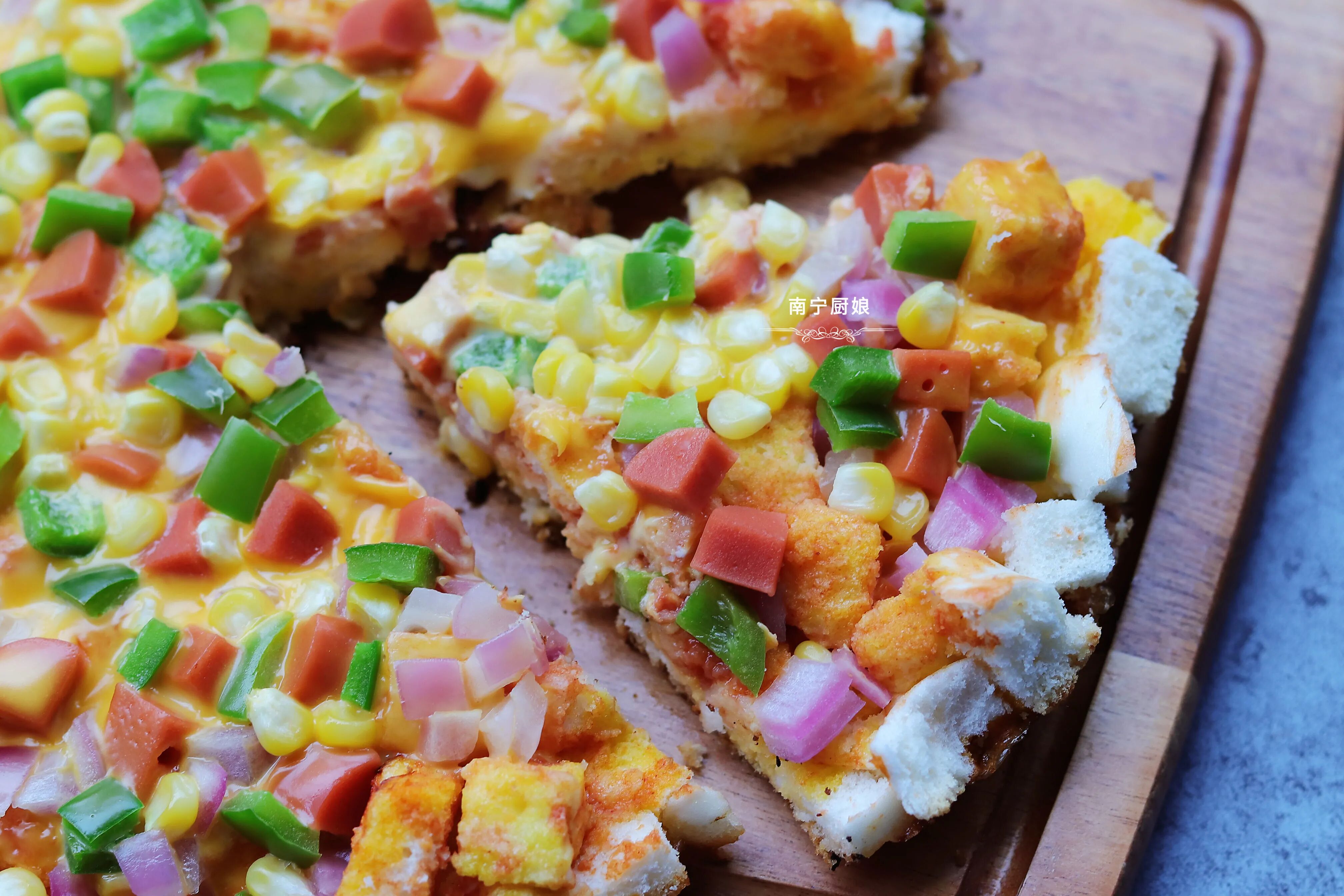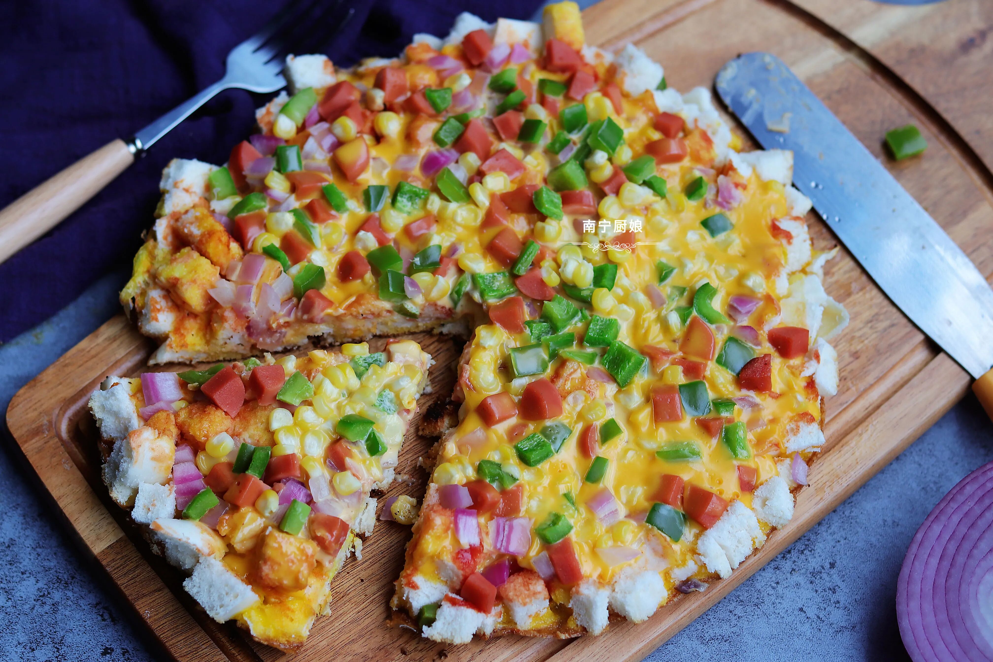 4、大家可以脑洞大开一下,不仅可以用馒头来做披萨,其实吃不完的面包也是可以的,大家可以多尝试下,肯定有很多惊喜。