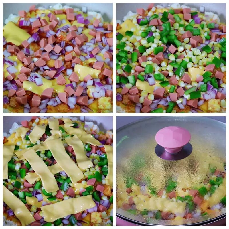 3、添加辅料:煎至披萨底部出现微微焦黄的时候,就调大火,端起平底锅摇晃几下,让接触锅底的那一面都均匀的受热,然后调小火。依次放入洋葱、火腿、玉米、青椒、奶酪,盖上锅盖焖制3分钟左右。