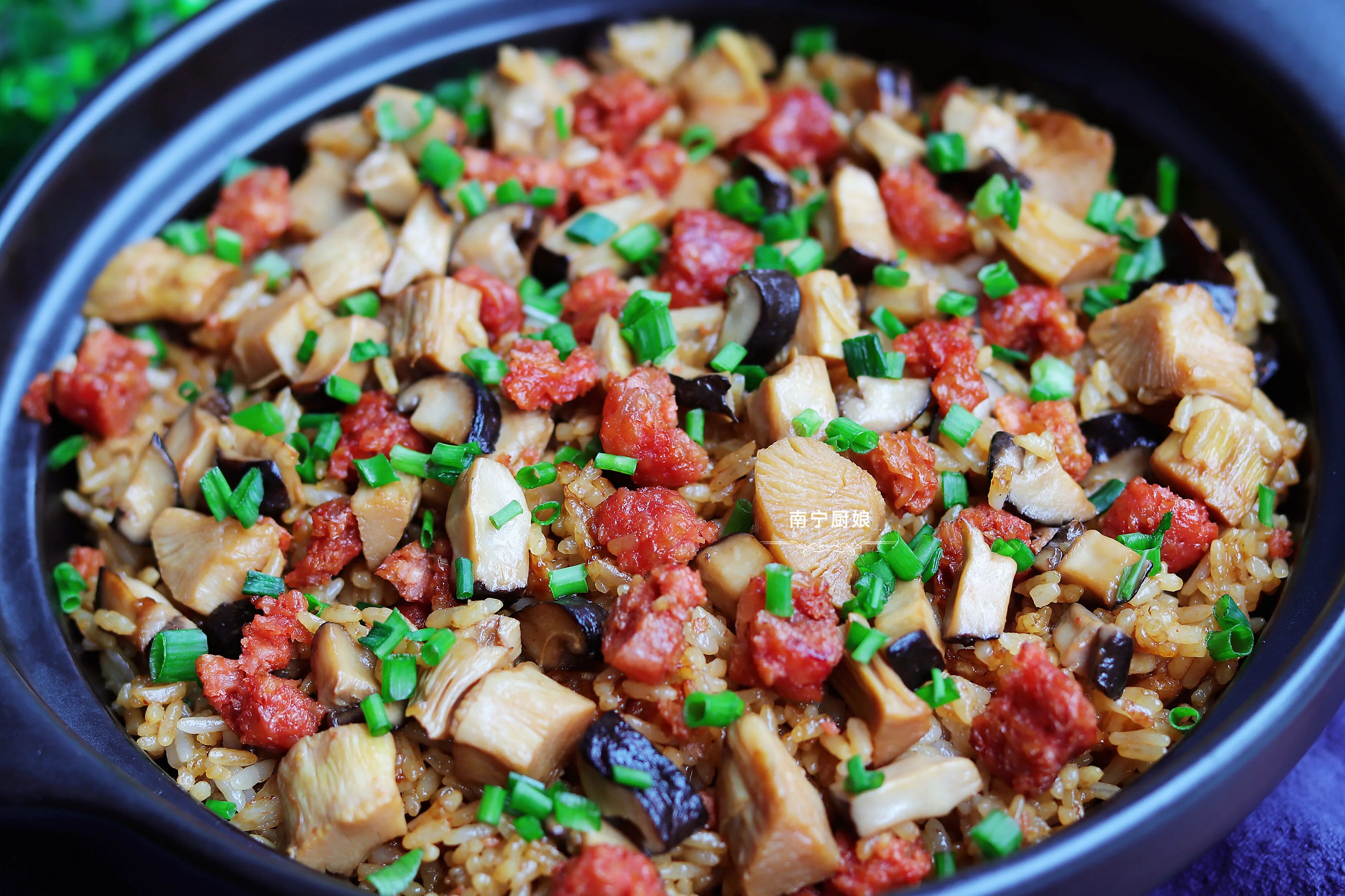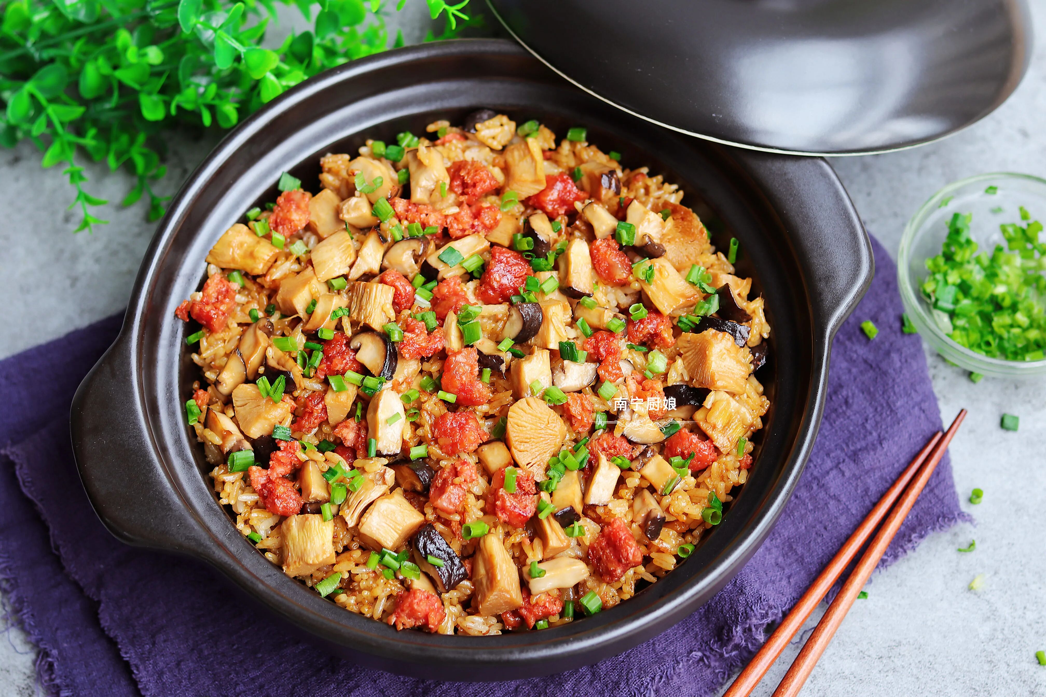 这道竹笋香菇焖饭中不仅有竹笋和香菇这两种鲜味十足的食材,还有腊肠这种别有风味的食材,全部食材加入大米一起煲煮后,大米中融合了3种食材的香味,不仅营养美味,还能充分的提振食欲,让人吃一次就念念不忘。