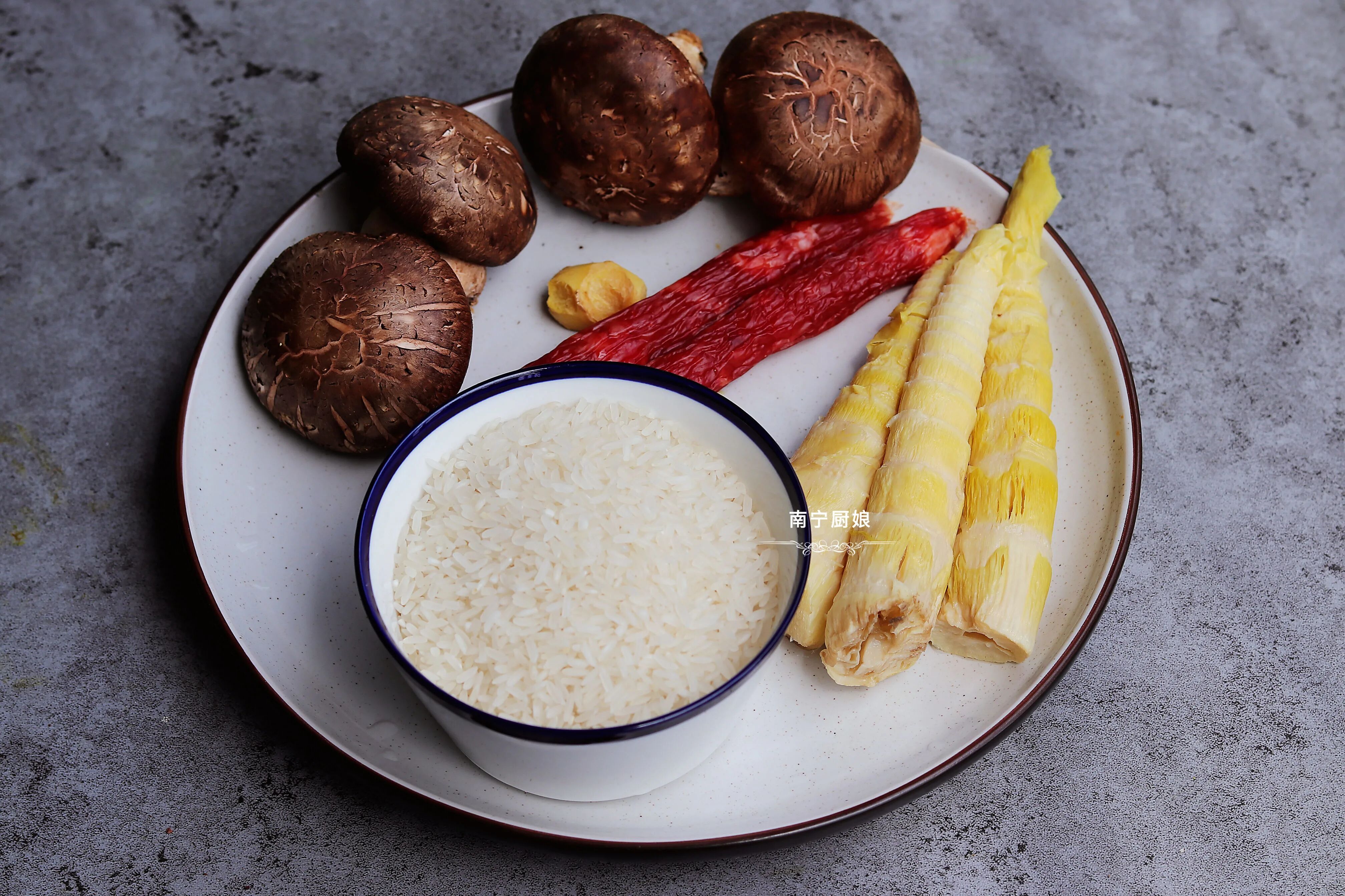 三根腌笋,四个鲜香菇,大米(一碗的量),两根腊肠,十五克食用油,十五克生抽,五克老抽,十五克耗油,三克糖,一克白胡椒粉,一些姜末,二百四十克水,一根小葱。