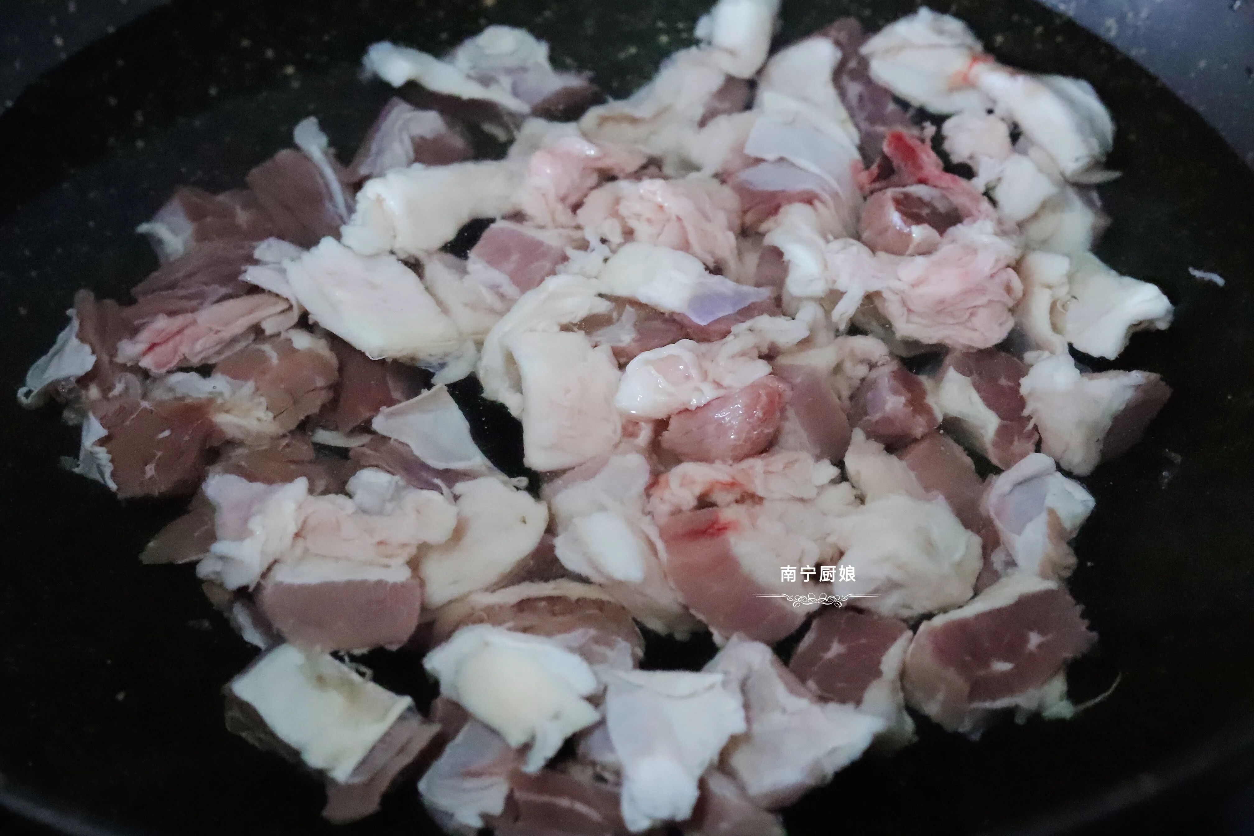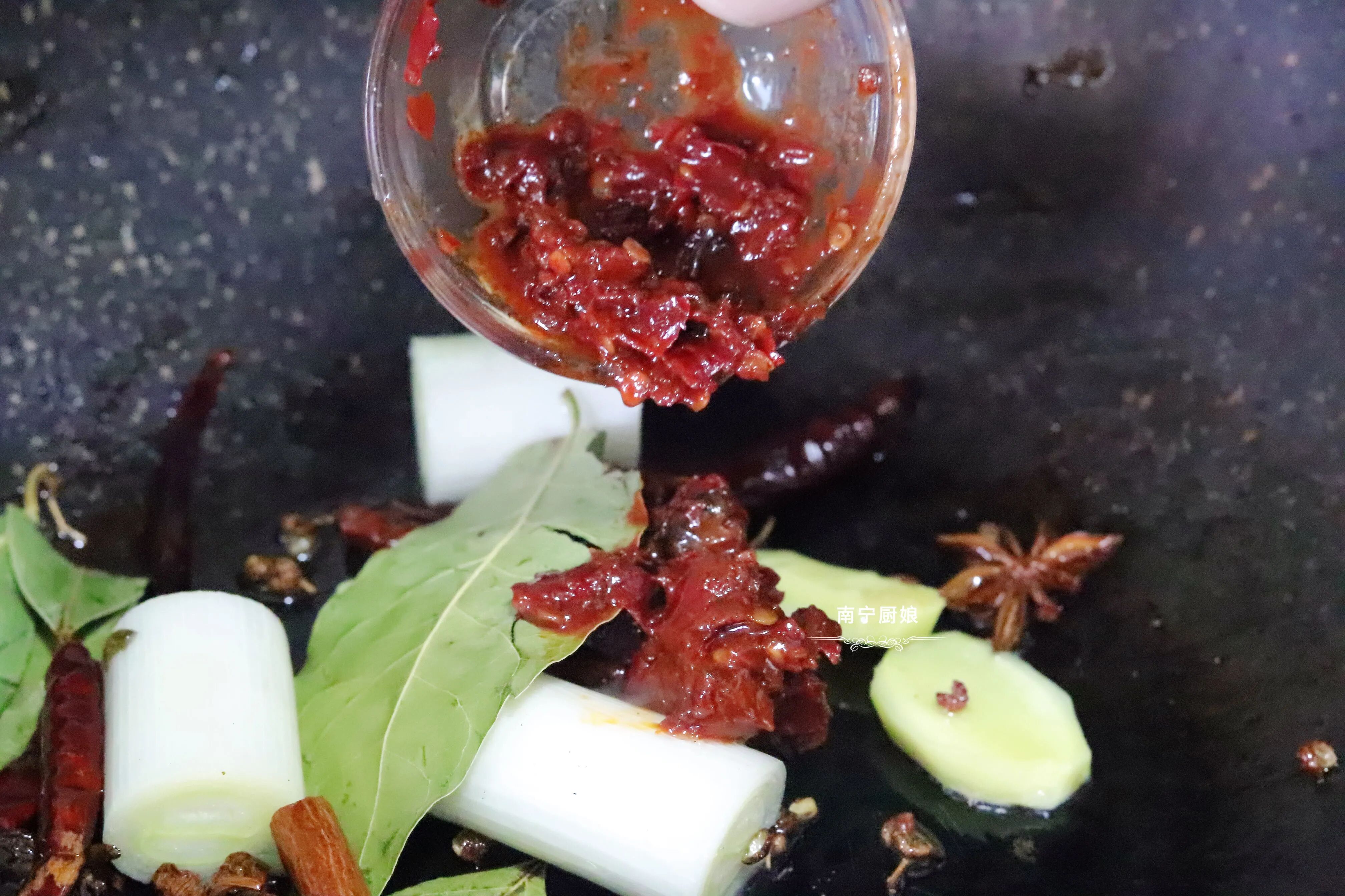 步骤3:红油煮开后,放入焯过水的牛肉、冰糖均匀地翻炒,接着放入生抽、老抽、适量清水,开大火煮至水开,再转中小火慢慢煮上一个小时,熬制鲜美的牛肉汤。