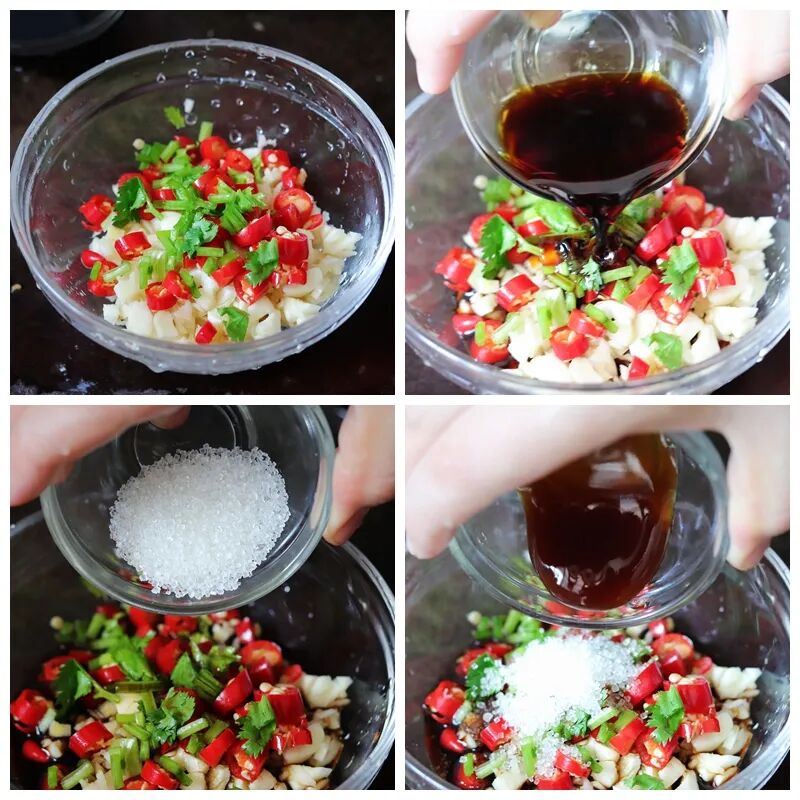 第二步,调好锡纸花甲粉的酱汁。先把蒜末、香菜段、辣椒圈放入小碗中,再先把生抽、蚝油、白砂糖依次放入混合均匀,放好备用。