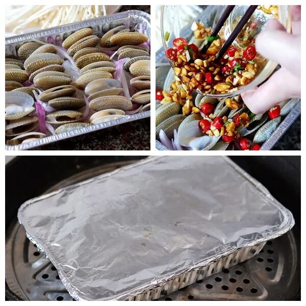 第四步,把吐完沙的花蛤和刚才冷水泡着的粉丝捞出来,然后在锡纸上依次铺上洋葱丝、金针菇、粉丝、花蛤,均匀地浇上刚才调制好的酱汁,接着摆上姜片。