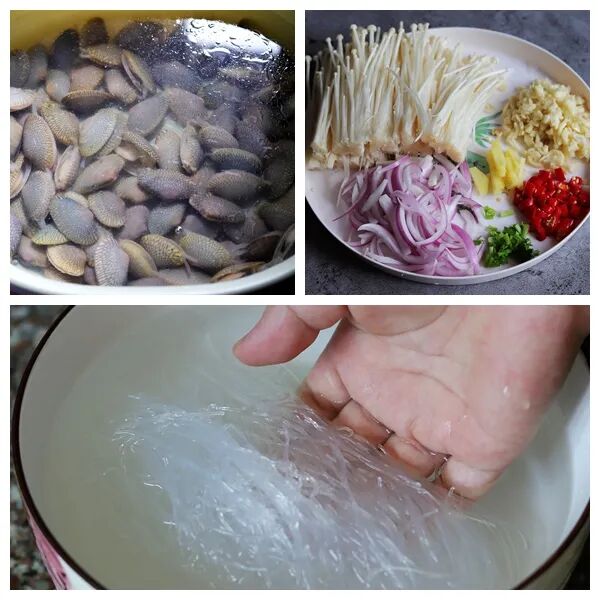所需食材:花蛤500g,龙口粉丝1把,金针菇200g,洋葱0.5个,生姜3片,小米椒4颗,香菜1根,蒜15瓣。