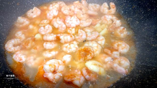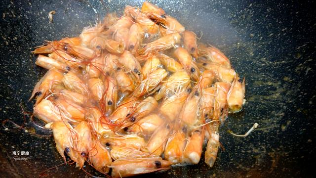 第三步,起锅,开中火把锅面烧干,然后倒入食用油,等到油热了就倒入虾头,不断翻炒,煸出虾油,再捞出虾头。留下锅中的虾油。接着倒入已经腌制好的虾仁,均匀翻炒,直到虾仁炒熟,再盛起来备用。