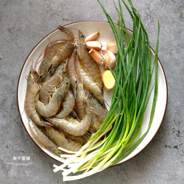 第一步,处理活虾,去掉活虾的虾头、虾线,再把虾壳也摘掉,然后用清水清洗干净,装盘备用;将香葱、大蒜和生姜清洗干净,香葱用刀切成香葱段;大蒜先用刀背拍碎,再把皮去干净,然后切成蒜末;生姜先把皮削掉再切成生姜条备用。