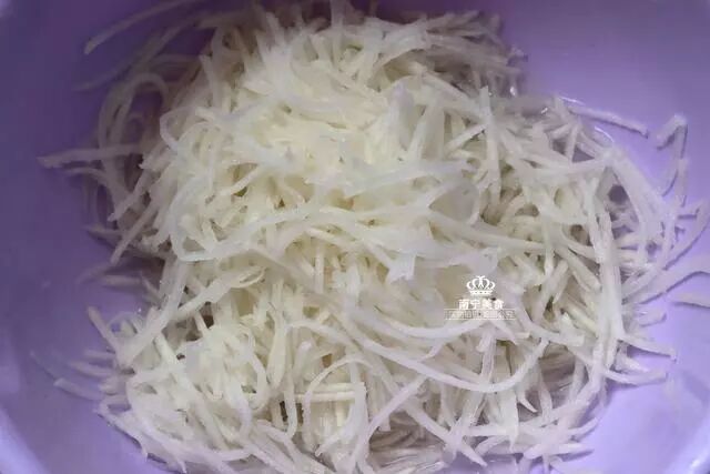 1、把白萝卜去皮后刮丝,放入盆中,再放入一勺食盐,腌制白萝卜丝脱水。