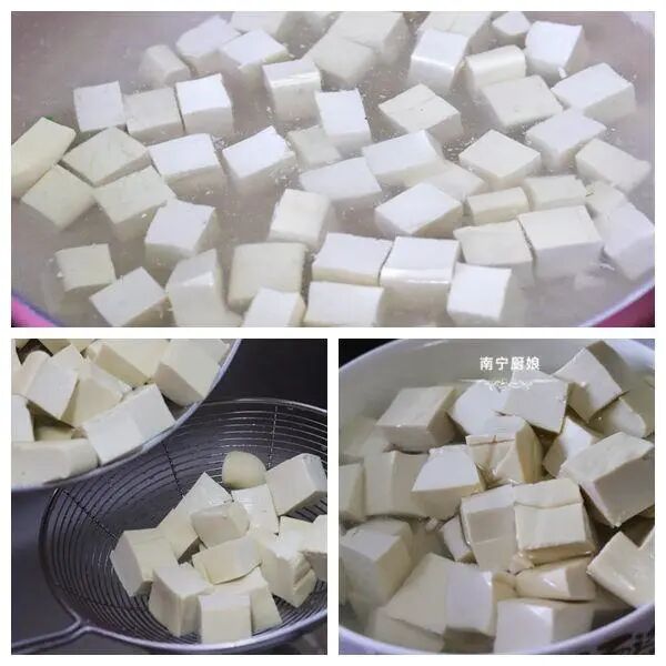 2,豆腐浸泡后,一定要焯一次水,捞出来后抓紧时间将其转入冷水中放置。(冷热交替的这一做法会让豆腐整体的质地更加有韧性,可以说,这是前面用盐水浸泡后的加强步骤,下锅后就更不容易碎掉。)