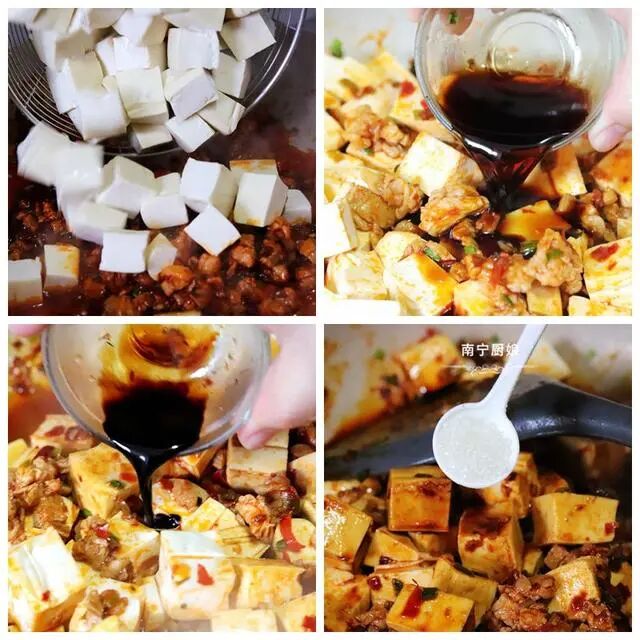 2,将浸入冷水的豆腐捞出来,沥干水分,倒入锅中,同肉沫一起翻炒,再一次添加生抽、酱油和盐调味。这时候菜品的颜值与味道已经开始显露了。