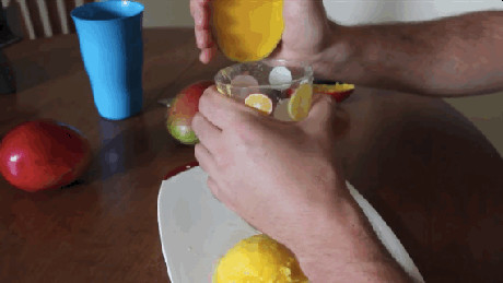 从中间切开,留出核的那一层。用薄玻璃杯口把芒果肉刮下来,一整块果肉,想想就好爽!