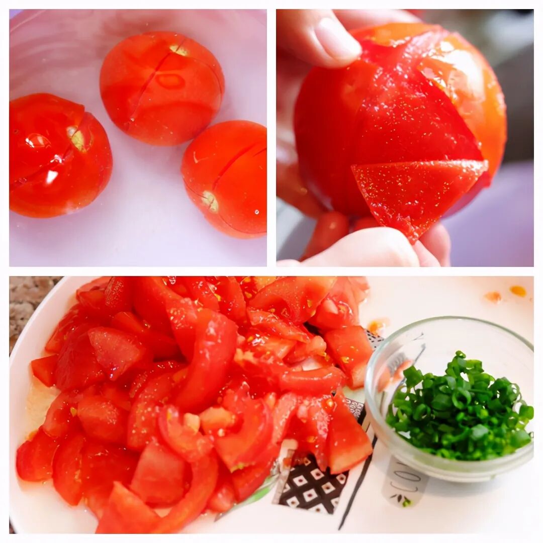 1、清洗干净西红柿,将西红柿蒂去除。在西红柿底部外皮切上十字刀,使用开水冲烫西红柿,将西红柿皮撕下,切成小块。另外将小葱洗净切为葱花。