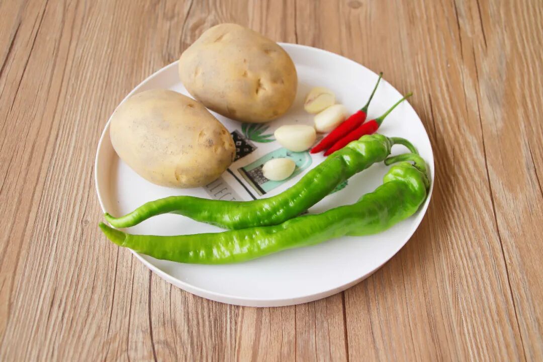 准备好食材:土豆2个、青椒1根、小米辣适量、大蒜适量