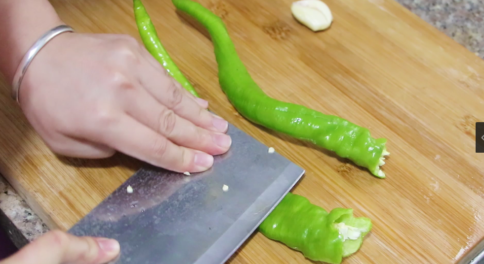 第二步,用水把青椒洗好后,再把辣椒籽去掉,按扁之后,切成段,放一旁。大蒜切成蒜片,小米辣切成圈,一起放碟子里。