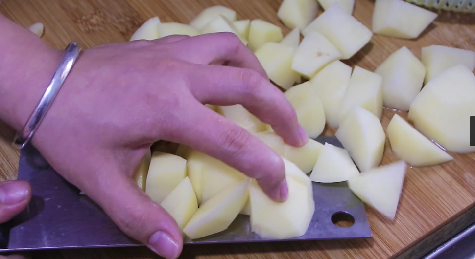 1、把土豆切成三角形的块状,这样形状的土豆能够炖煮更长的时间,不容易化开。