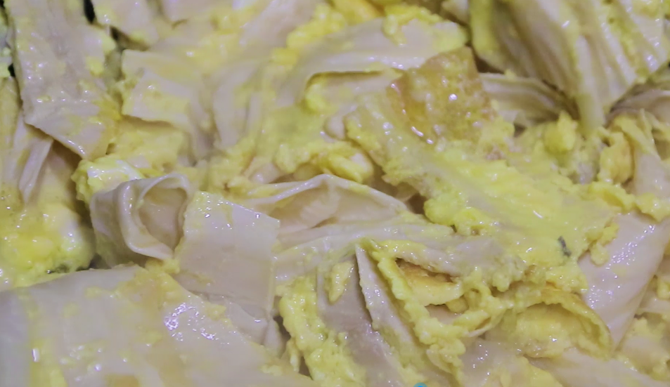 第四步,在装有腐竹的碗里,倒入之前打好的鸡蛋液,把蛋液和腐竹搅拌均匀,让每块腐竹都均匀地裹上一层蛋液。锅里下油,油温升高之后,倒入裹好蛋液的辅助,煎到腐竹定型鸡蛋凝固,这样煎出来的腐竹特别的鲜香,等锅里没有多余的水分的时候,就可以出锅备用。