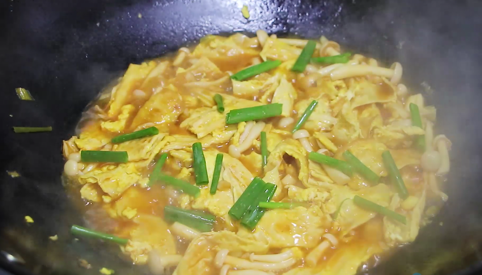 第六步,水开之后,把腐竹重新下入锅中,翻拌均匀之后,撒上少量的白胡椒粉,让腐竹在锅内焖煮5分钟左右,时间到之后,撒上青葱段,咱们的鸡蛋腐竹蘑菇锅就可以出锅啦。