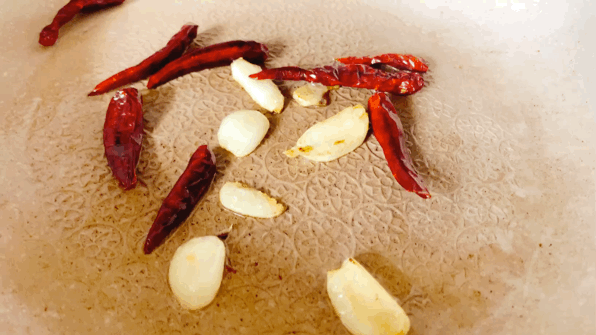3、继续使用刚才炒过洋葱的底油加热后放入蒜片和干辣椒一起爆香。