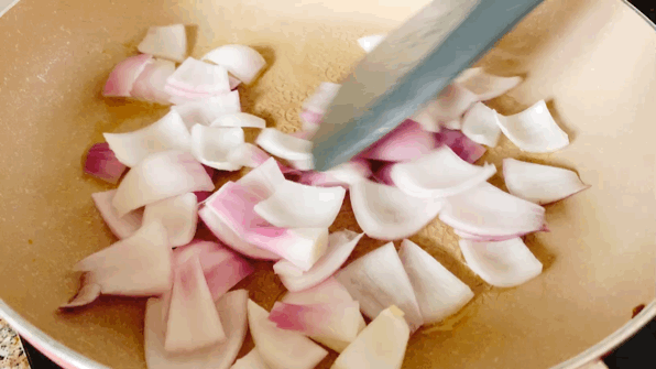2、起锅,在锅中倒入适量的食用油,小火烧热,把洋葱块倒入翻炒至半透明状后盛出待用。