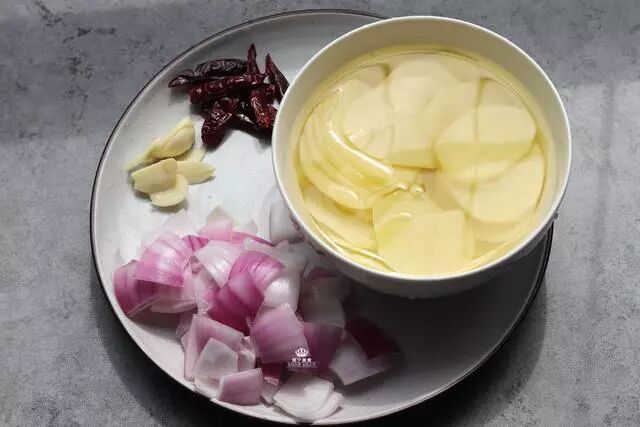 1、洋葱剥掉外层坏掉的部分,然后切块,大蒜去掉蒜衣切片,土豆去皮后切片放入装有水的碗里浸泡着,一方面是可以洗掉表面的淀粉,一方面是可以防止土豆接触空气后氧化变黑。