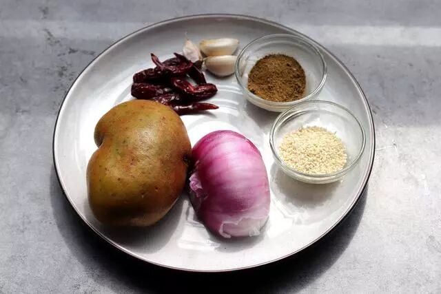 准备好食材:土豆一大个、洋葱半个、干辣椒6颗、大蒜3粒、孜然粉5克、食盐1勺、香葱1根。