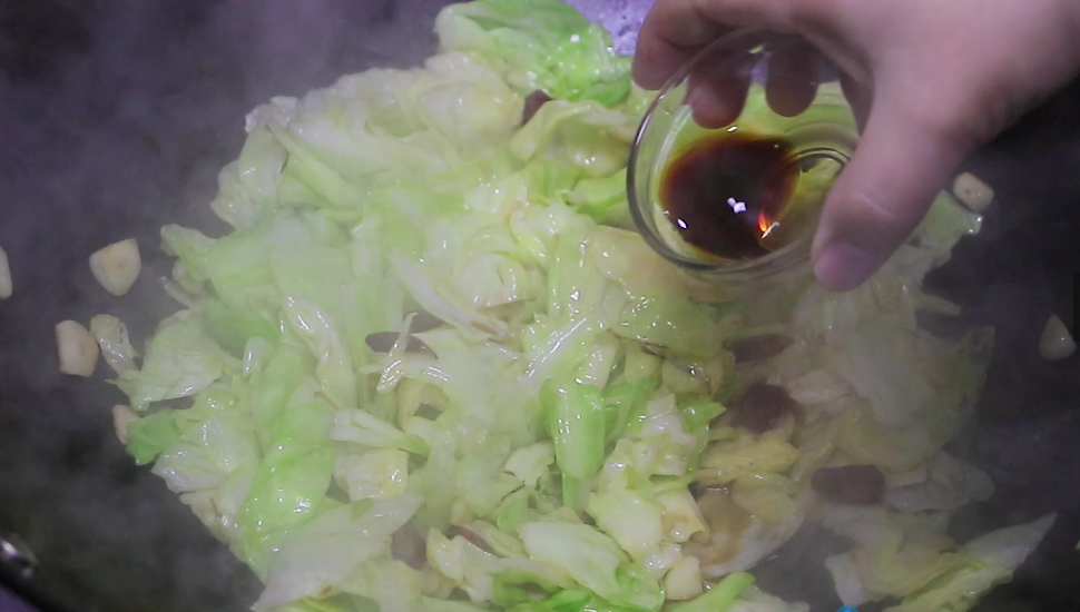 第六步,用大火炒到包菜8分熟的时候,就可以加入少量的食盐调味,再加入少量的白糖提鲜,淋入一小勺的蚝油,快速翻炒均匀。等包菜9分熟的时候,再淋入少量的生抽及陈醋,这时候淋入可以激发出陈醋及生抽的香味,锅内的包菜叶子也能很好地吸收酱汁。继续翻炒到包菜熟透就可以出锅啦。