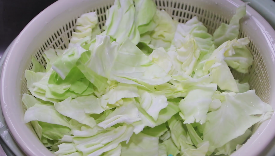 第四步,这时包菜也泡好啦,咱们用流水把包菜冲洗干净,再把包菜里的水分甩干,放在菜篮子里。用手把包菜的叶子一块块地撕下来,不要菜帮子,菜叶子都撕好之后,继续放在一旁沥干水分备用。
